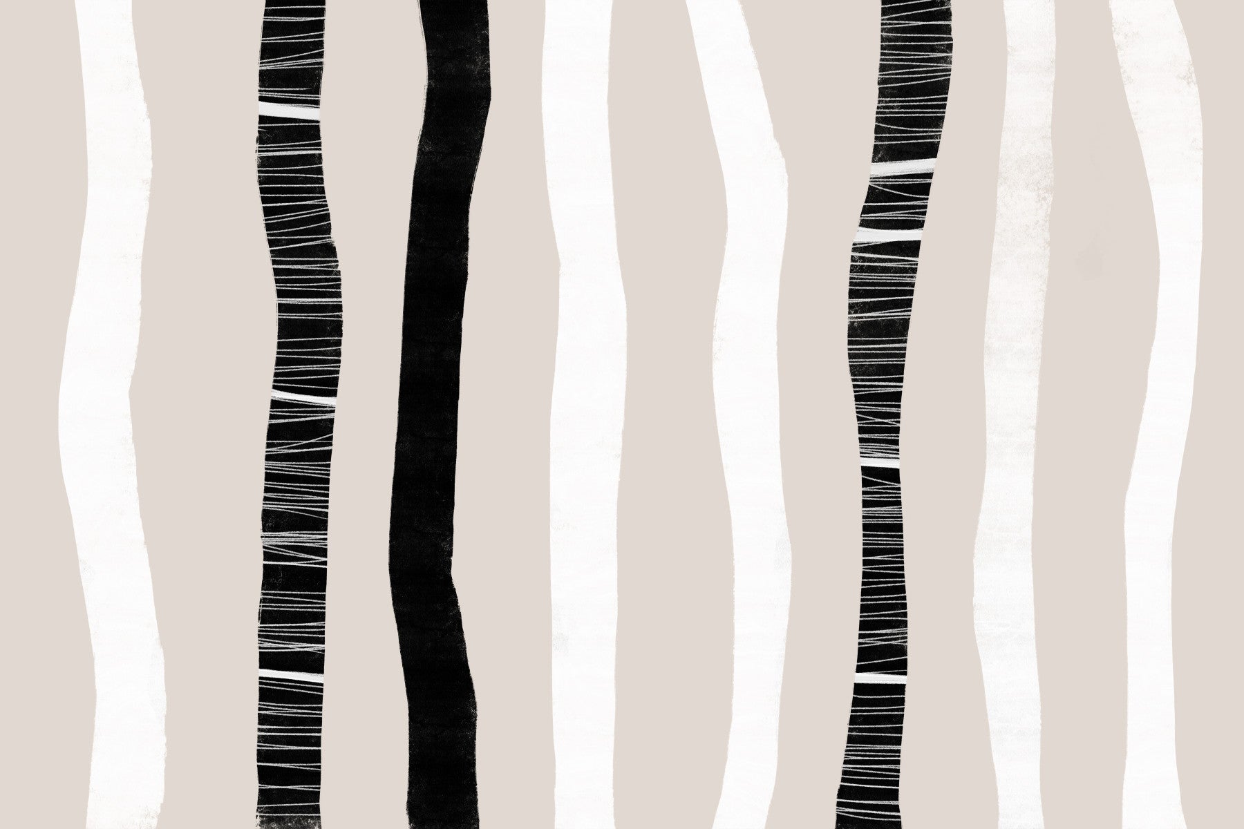 This monochrome stripe design provides a sophisticated statement for any room. Simple shapes and brushstroke textures combine for a clean, modern look. The neutral beige backdrop accentuates bold black and white lines, creating a balanced, artistic statement. Ideal for bedrooms, living rooms, or hallways. Use this wallpaper for walls to make a feature wall or to create a relaxing and harmonious atmosphere. This design works well with minimalist furniture and contemporary decor.