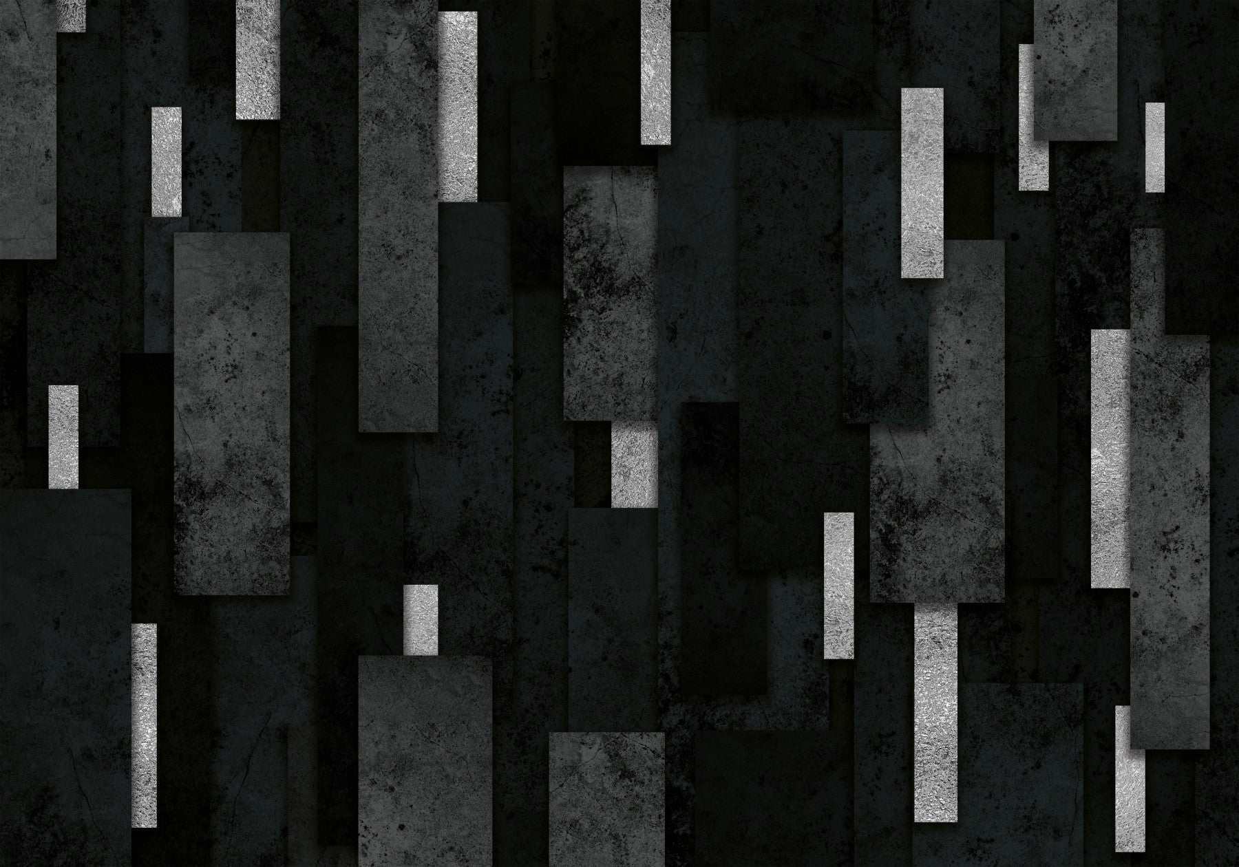 Transform your space with this modern abstract wallpaper for walls. Dark greys and subtle silvers create a sophisticated look. It features stacked geometric shapes and a textured effect, perfect for a living room, hallway, or home office. The design adds a unique edge, complements concrete floors, and enhances industrial or minimalist interiors.