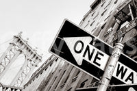 Navigate the concrete jungle with 'Urban Direction: NYC,' a striking black and white wallpaper that captures the raw energy and iconic landmarks of New York City. The image focuses on a 'One Way' sign, a ubiquitous symbol of the city's relentless forward momentum. Weathered and adorned with street art stickers, the sign embodies the gritty authenticity of the urban landscape. In the backdrop, a classic brick building stretches towards the sky, fire escapes providing an architectural contrast. The iconic Manhattan Bridge looms in the distance, a reminder of the city's enduring history and ambition. This high-contrast image perfectly encapsulates the spirit of exploration and the singular path of life in the city that never sleeps. Bring a piece of the Big Apple's dynamic energy to your screen with this bold and evocative wallpaper.