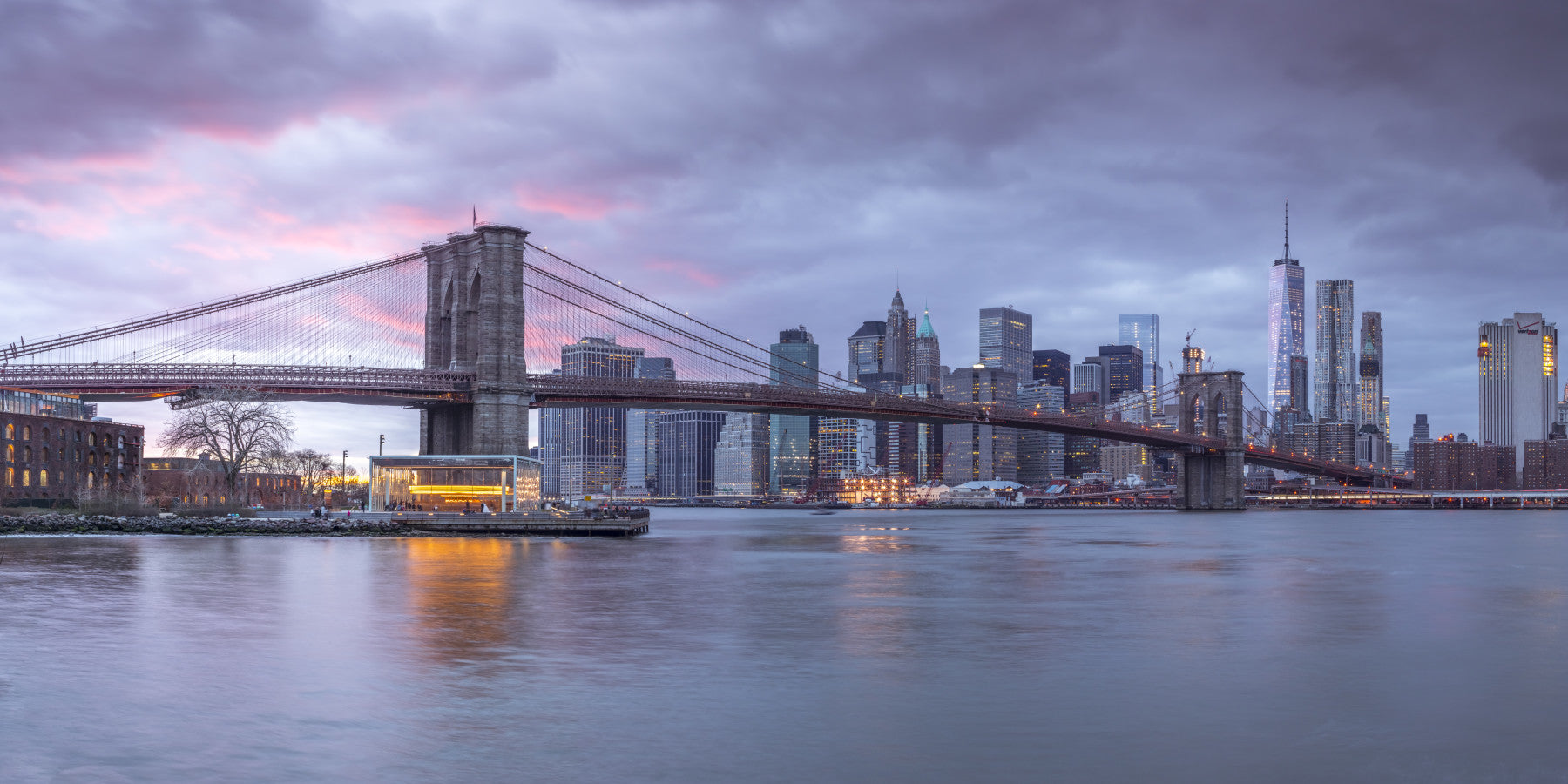 Brooklyn Bridge over East river, New York. Adorn your walls with the majestic allure of New York City's skyline at dusk. The Brooklyn Bridge stands as a symbol of connection, framed by the soft, muted colors of the setting sun. This scenic wallpaper for walls presents an image of serene strength. It is a wonderful selection for a living room feature wall, office, or bedroom, seamlessly blending into contemporary and classic designs. Embrace the tranquil energy and iconic beauty this wallpaper provides.