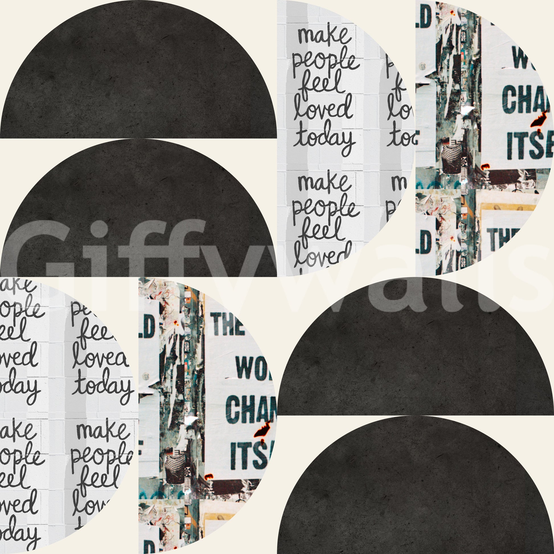 A captivating blend of urban grit and calming minimalism, this wallpaper features a unique interplay of textures and messages. Dark, textured semi-circles contrast sharply against a creamy off-white backdrop, creating a visually striking geometric pattern. Sections of layered street posters add a touch of urban realism, intermingled with the hand-painted message 'Make people feel loved today', which evokes a sense of hope and positivity amidst the city's chaos. The overall effect is a sophisticated yet approachable design, ideal for adding a touch of modern artistry to any space.