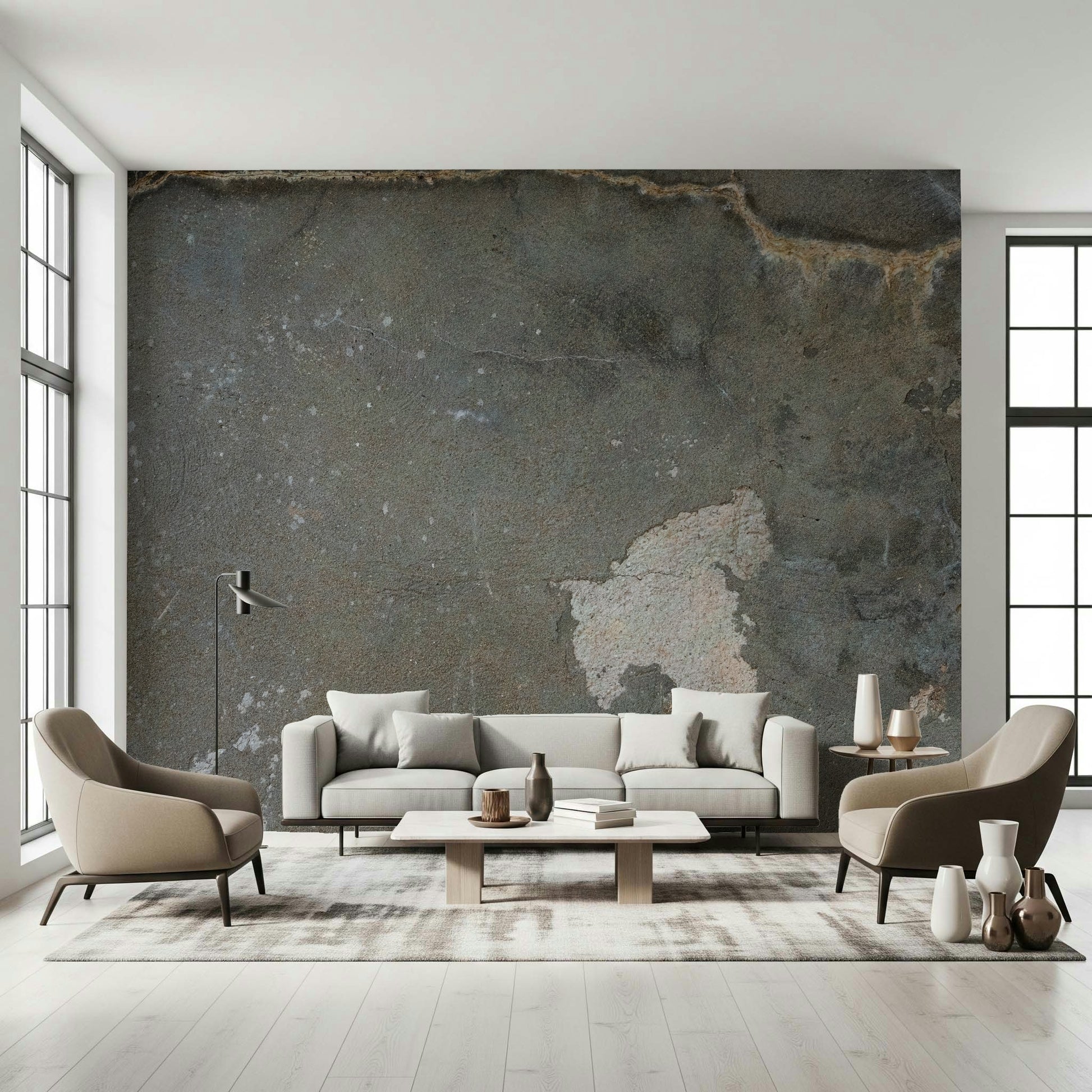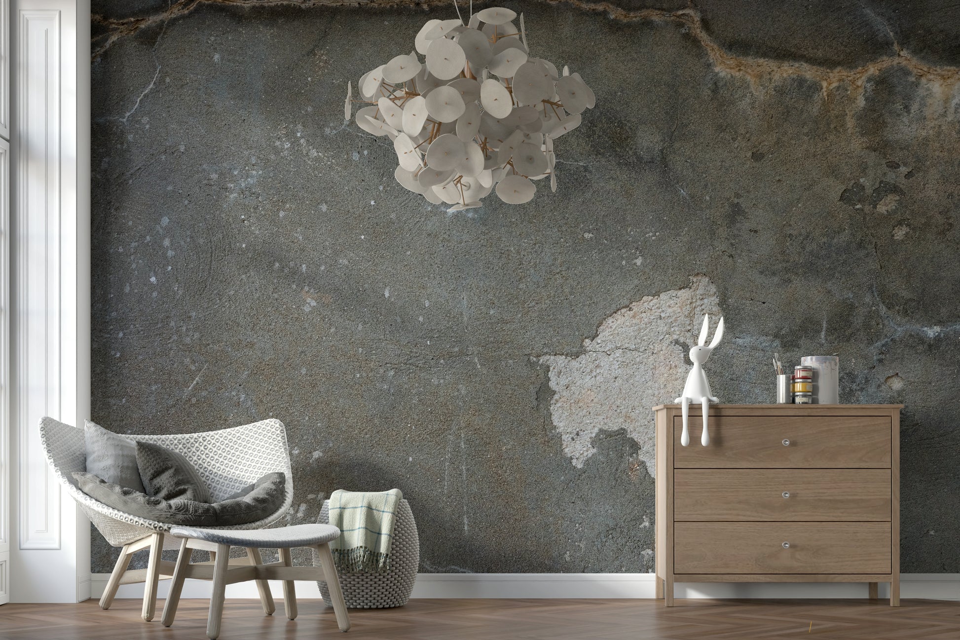 This wallpaper features a distressed concrete pattern that simulates the look of aged concrete. Its cool grey tones and slight imperfections add dimension to walls. Utilise this wallpaper for walls in any space looking to achieve a modern and urban ambiance. It enhances the overall aesthetic by complementing sleek, minimalist interiors with touches of metal.