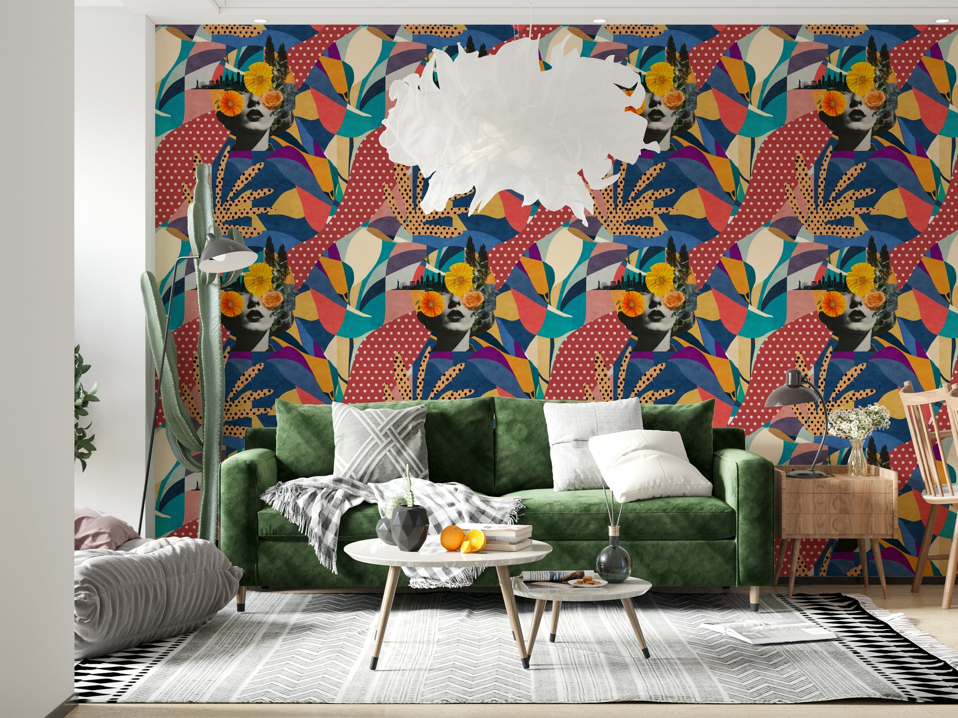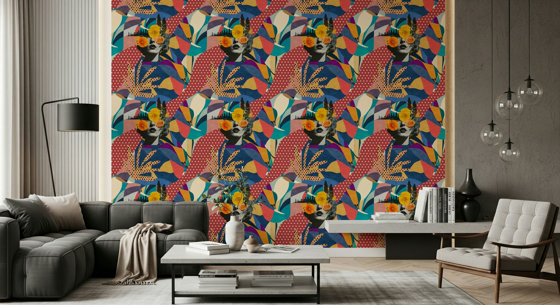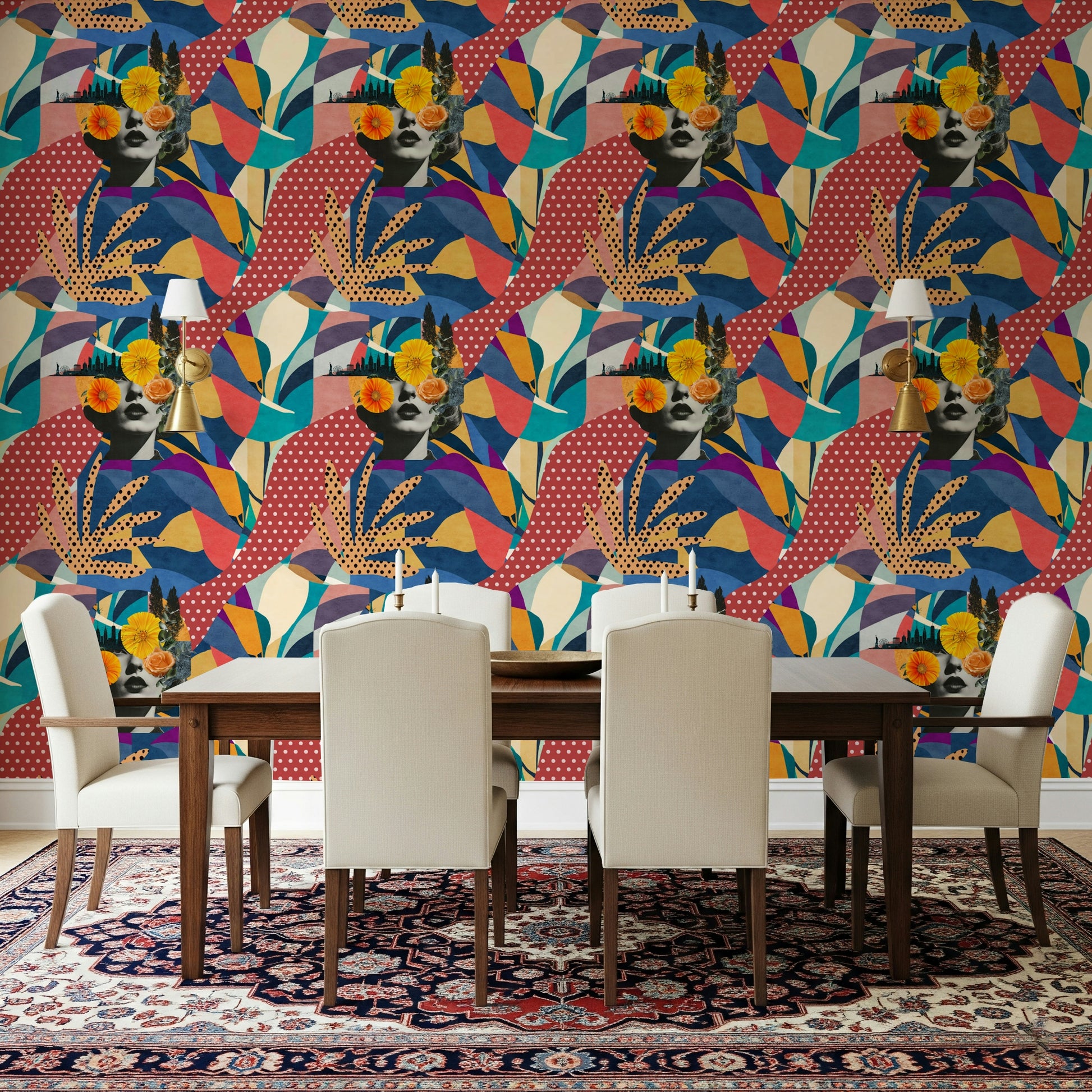 Immerse your space in the vibrant energy of "Urban Muse", a captivating collage that harmonises the allure of city life with the delicate beauty of nature. This artistic statement showcases a vintage-inspired portrait overlaid with bold, abstract patterns in a rich palette of blues, reds, and yellows. The silhouette of a bustling cityscape, complete with iconic landmarks, subtly graces the backdrop, while delicate floral accents add a touch of organic charm. The result is a sophisticated yet playful design that breathes life into any room, lending it an air of mystery and modern elegance. The distinctive blend of geometric shapes and organic motifs makes this piece a conversation starter and a captivating focal point that will elevate the aesthetic of your personal haven.