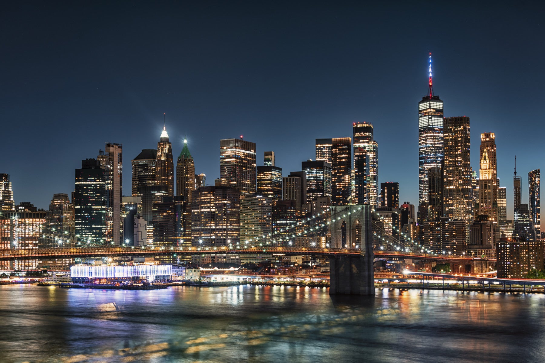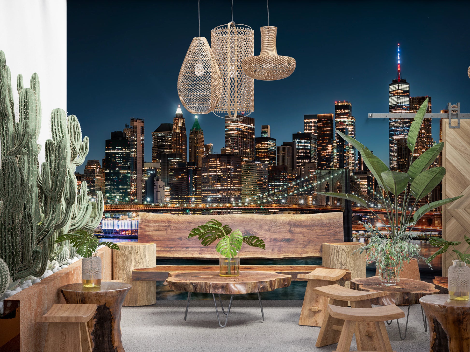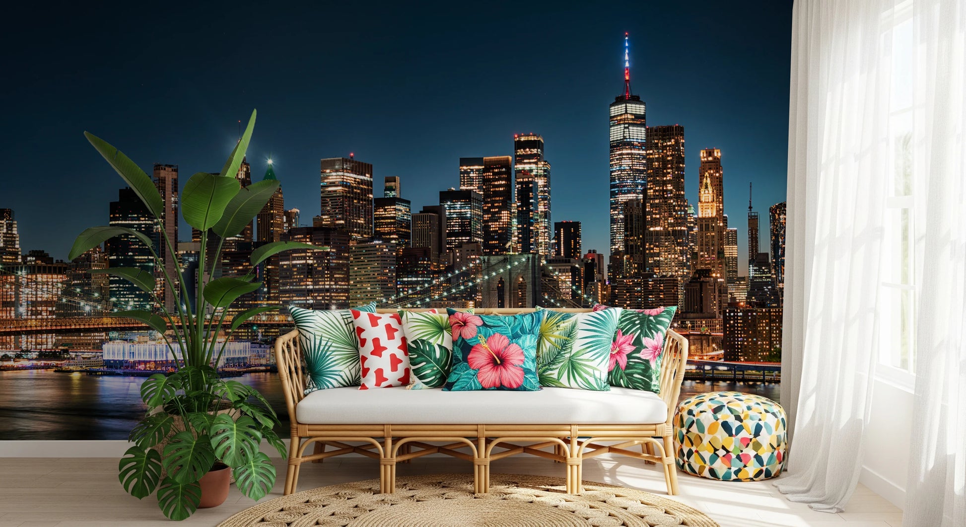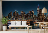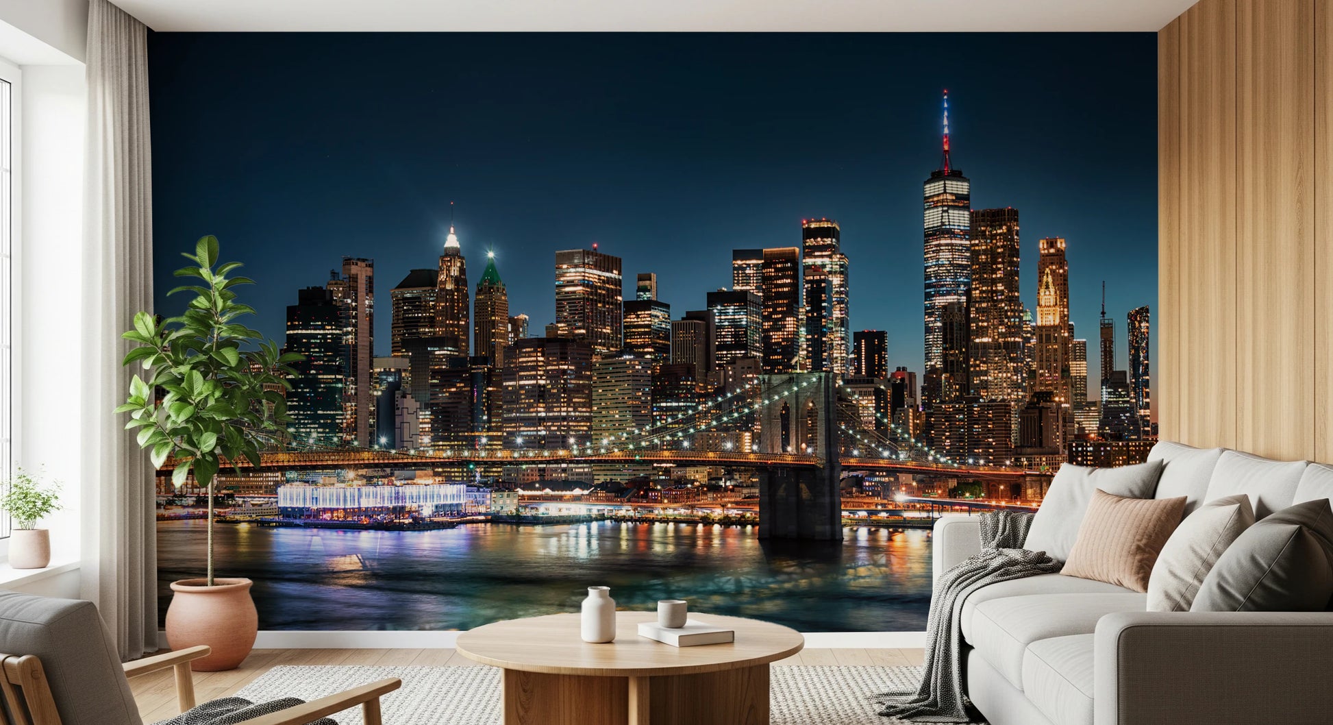 Elevate your space with a dynamic urban nightscape. This breathtaking wallpaper for walls features the sparkling lights of New York City and the majestic Brooklyn Bridge reflected on the water. The dominant colours are a deep indigo and amber that capture the nighttime ambience. The wallpaper creates a focal point in any room. Consider installing it in a dining area or a loft to bring the vibrant energy of the city to your interior. Add a touch of sophisticated charm with this statement piece.