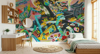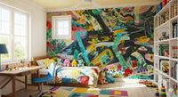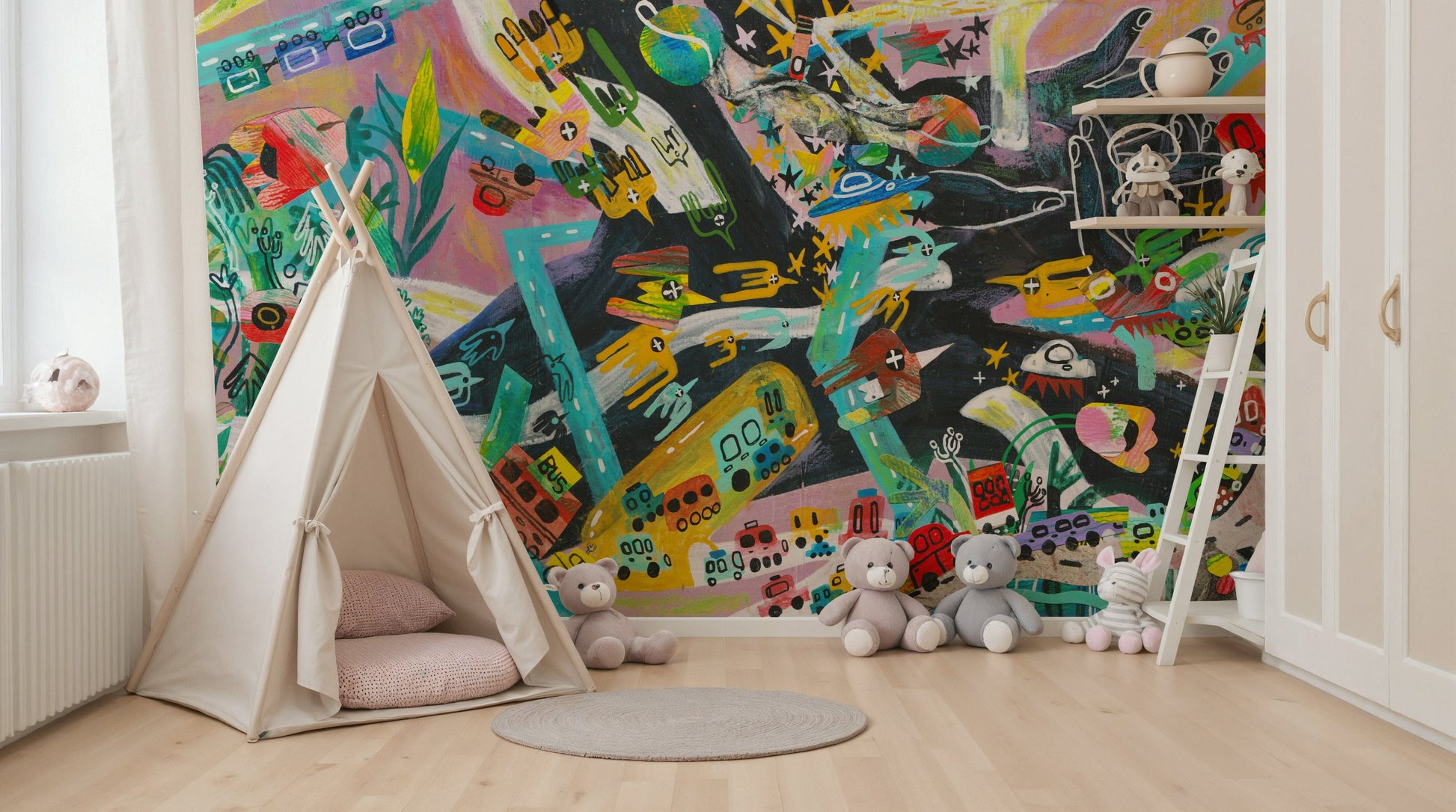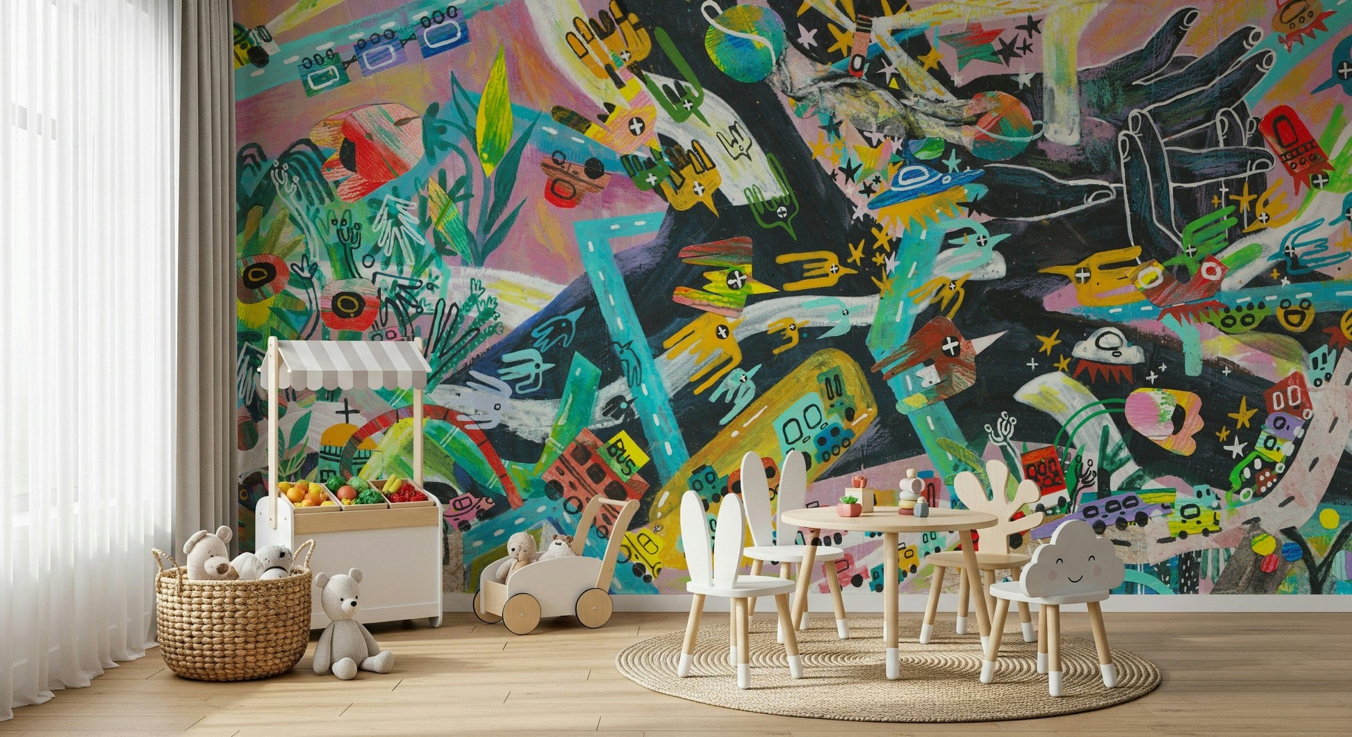 Embrace vibrant energy with this abstract cityscape wallpaper for walls. Bursting with lively colours and whimsical details, the design features cars, roads, planets and birds! This playful creation instantly enlivens any space. Let it transform kids rooms, play areas, or studio walls. The unique artistic style creates an imaginative atmosphere, making it a striking statement piece that captivates and inspires. It blends youthful charm with modern art, enhancing interior decor.