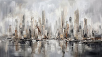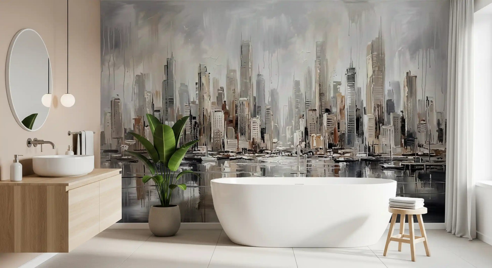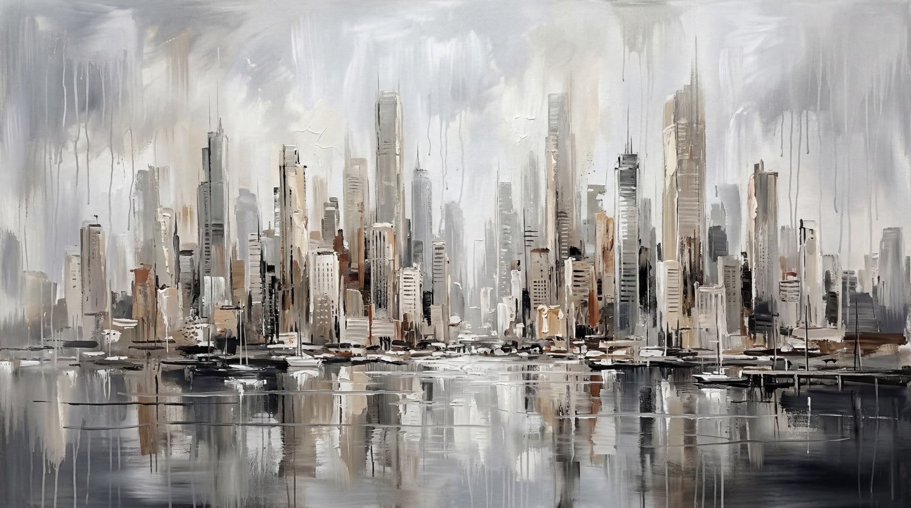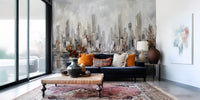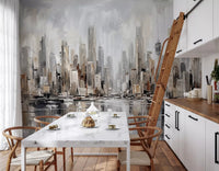 Transform your living space with this captivating abstract cityscape wallpaper for walls. Dynamic brushstrokes and textured paint drips create a modern urban panorama, reflecting towering structures across serene waters. A sophisticated palette of muted greys, crisp whites, deep blacks, and warm earthy browns defines this artistic design. This unique wallpaper offers a painterly depth that enhances any room. Install it in a contemporary living room, an elegant dining area, a productive home office, or a chic hallway to introduce an inspiring focal point. The dramatic reflections and expressive style add a metropolitan sophistication, complementing minimalist or industrial interiors beautifully.