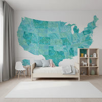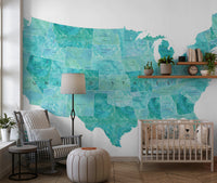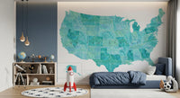 USA map with states and capitals in teal watercolor Wall Mural
