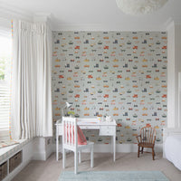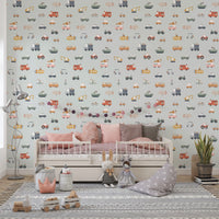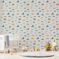 Embark on a playful journey with this captivating vehicle-themed décor. Against a gentle light blue backdrop, a delightful assortment of modes of transport comes to life. From robust lorries and vibrant tractors to speedy motorcycles and towering ships, each vehicle is illustrated in a charming, hand-drawn style. The scene exudes a nostalgic charm, evoking memories of childhood adventures and imaginative play. Discover a world of possibilities and add a touch of whimsical character to any space. This decorative piece brings joy and a sense of wonder, transforming rooms into a vibrant canvas of exploration and discovery.