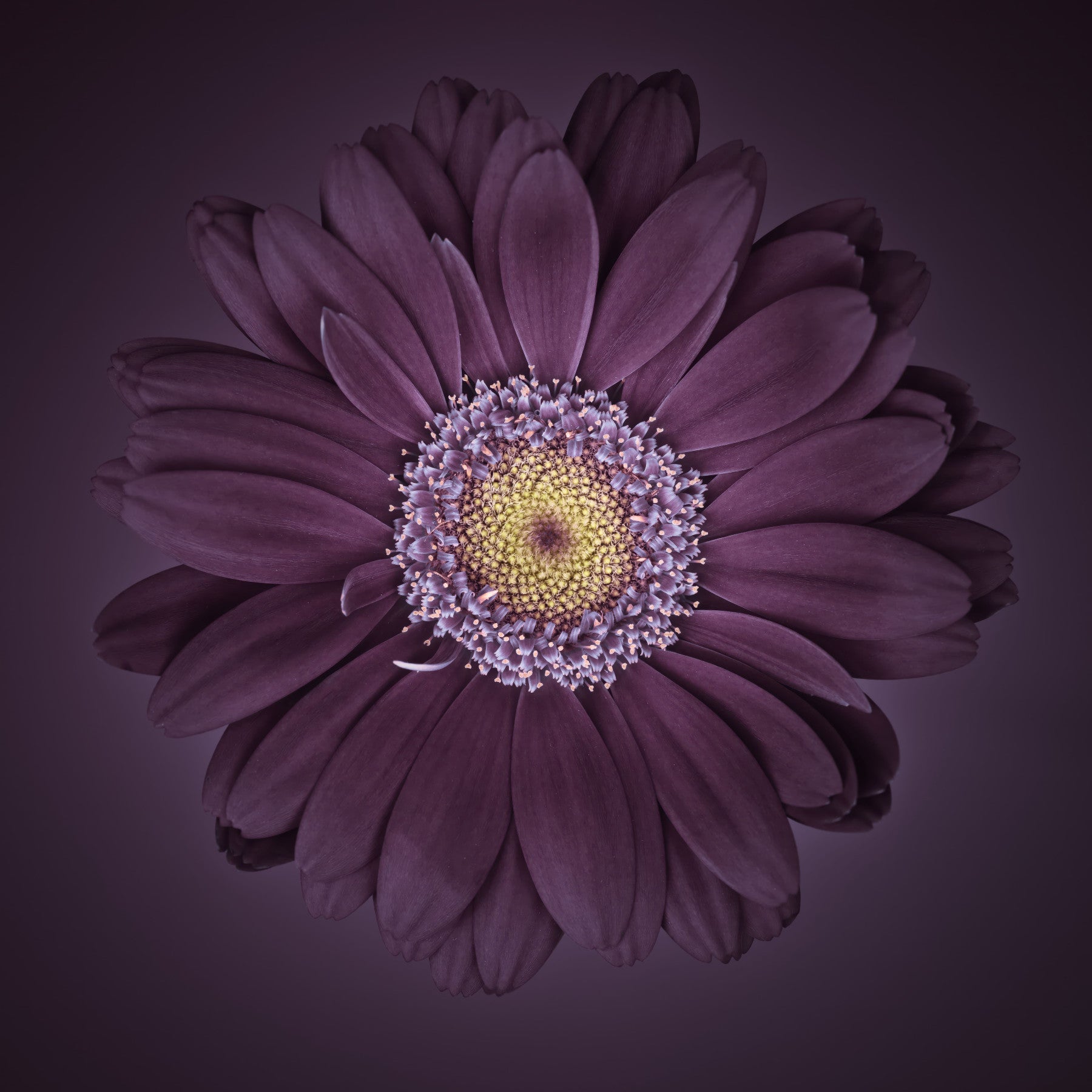 Indulge in the opulent beauty of "Velvet Bloom," a wallpaper featuring a richly hued, deep purple gerbera daisy. Each petal appears exquisitely textured, like soft velvet, creating a luxurious and sophisticated aesthetic. The central disc, a captivating blend of lavender and gold, adds a touch of ethereal elegance. This image evokes a feeling of quiet grace and understated opulence, perfect for those seeking a calming yet visually striking backdrop for their digital devices. The deep purple tones create a sense of mystery and depth, enhancing the overall luxurious and refined mood.