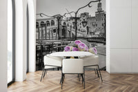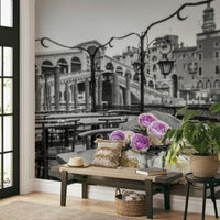 Bunch of roses on cafe table by Rialto bridge, Venice, Italy. Bring the romance of Venice into your home with this stunning wallpaper for walls. The selectively coloured floral arrangement pops against the greyscale backdrop of the city's iconic architecture, creating a sophisticated and artistic statement. The delicate roses and peonies in soft pinks and creams offer a touch of elegance, making it perfect for bedrooms, living rooms, or even entryways. This design lends itself well to interiors with a modern or classic style, adding depth and visual interest to create an inviting atmosphere.