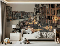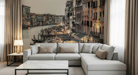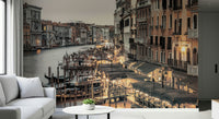 The grand canal from the Rialto bridge at night, Venice, Italy. Immerse yourself in the tranquil beauty of "Venetian Canal Evening," a captivating wallpaper that transports you to the heart of Venice at twilight. The scene captures the iconic Grand Canal bathed in the warm, ethereal glow of evening lights. Gondolas gently bob along the water's surface, their sleek forms reflecting the shimmering reflections of the surrounding architecture. Ornate buildings, aged with character and history, line the canal, their windows hinting at the stories within. The air is thick with a sense of romance and timelessness as the city slowly transitions from day to night. The interplay of light and shadow creates a mesmerising display, highlighting the intricate details of the Venetian cityscape.