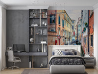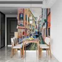Bring the serene beauty of Venice into your living space. This wallpaper for walls captures the timeless charm of a narrow Venetian canal, complete with colourful buildings, quaint boats, and the gentle reflections on the water's surface. The warm hues of terracotta, peach, and pale yellow buildings juxtapose with the cool blues and greens of the water, creating a visually appealing contrast. This design works perfectly in living rooms, dining rooms, or hallways, adding a touch of European elegance and relaxed atmosphere. The details in the architecture enhance the depth and character of any room.