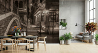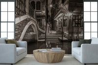 Night shot of cafe by narrow canal, Venice, Italy. Transform your living space with this striking Venetian canal scene. The muted sepia tones and detailed architectural elements offer a timeless elegance, perfect for creating a sophisticated atmosphere. This wallpaper for walls showcases a quiet canal at night, reflecting the soft glow of vintage lanterns. The intricate brickwork and wrought iron details bring depth and character to any room, making it ideal for a living room, dining area, or home office. This design adds a touch of European charm, blending seamlessly with both modern and classic décor.