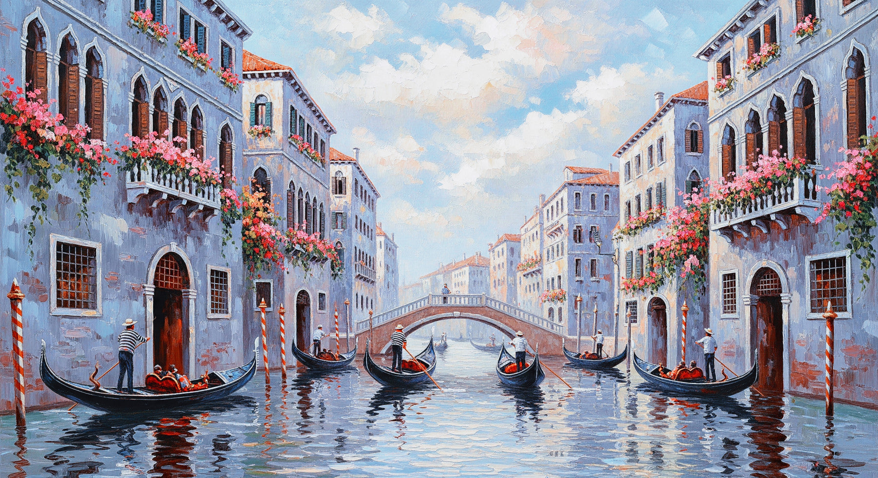 Float away to Venice with this idyllic painting. The water reflects soft light around the detailed buildings and the gondolas glide along the waterway. Flowers add a splash of color. The scene evokes peace and a touch of magic. As wallpaper for walls, this image brings classic charm to a living room or hallway. Let this design enhance your interiors and be a talking point of your guests.