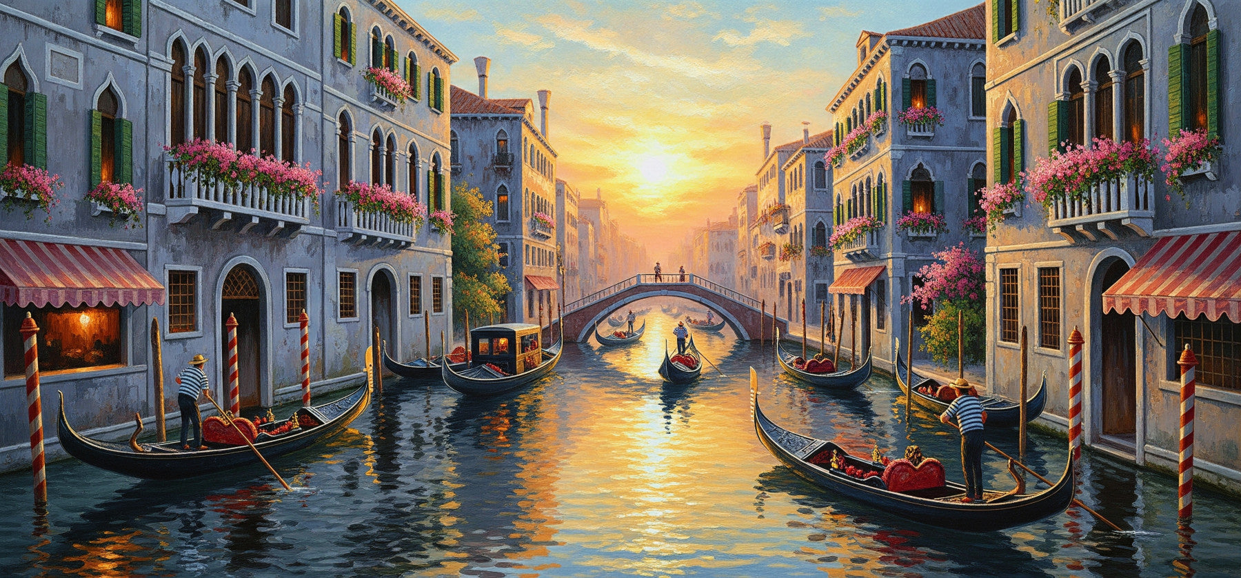 Drift away to a romantic Venetian vista with this idyllic wallpaper for walls. Warm sunlight bathes grand buildings and gentle gondolas, creating a peaceful atmosphere. Delicate pink flowers and soft blue hues work together. It brings a touch of old-world charm and golden light to your living room, bedroom, or dining area. Its composition delivers elegance and an inviting ambiance. Transform your space with this beautiful view.