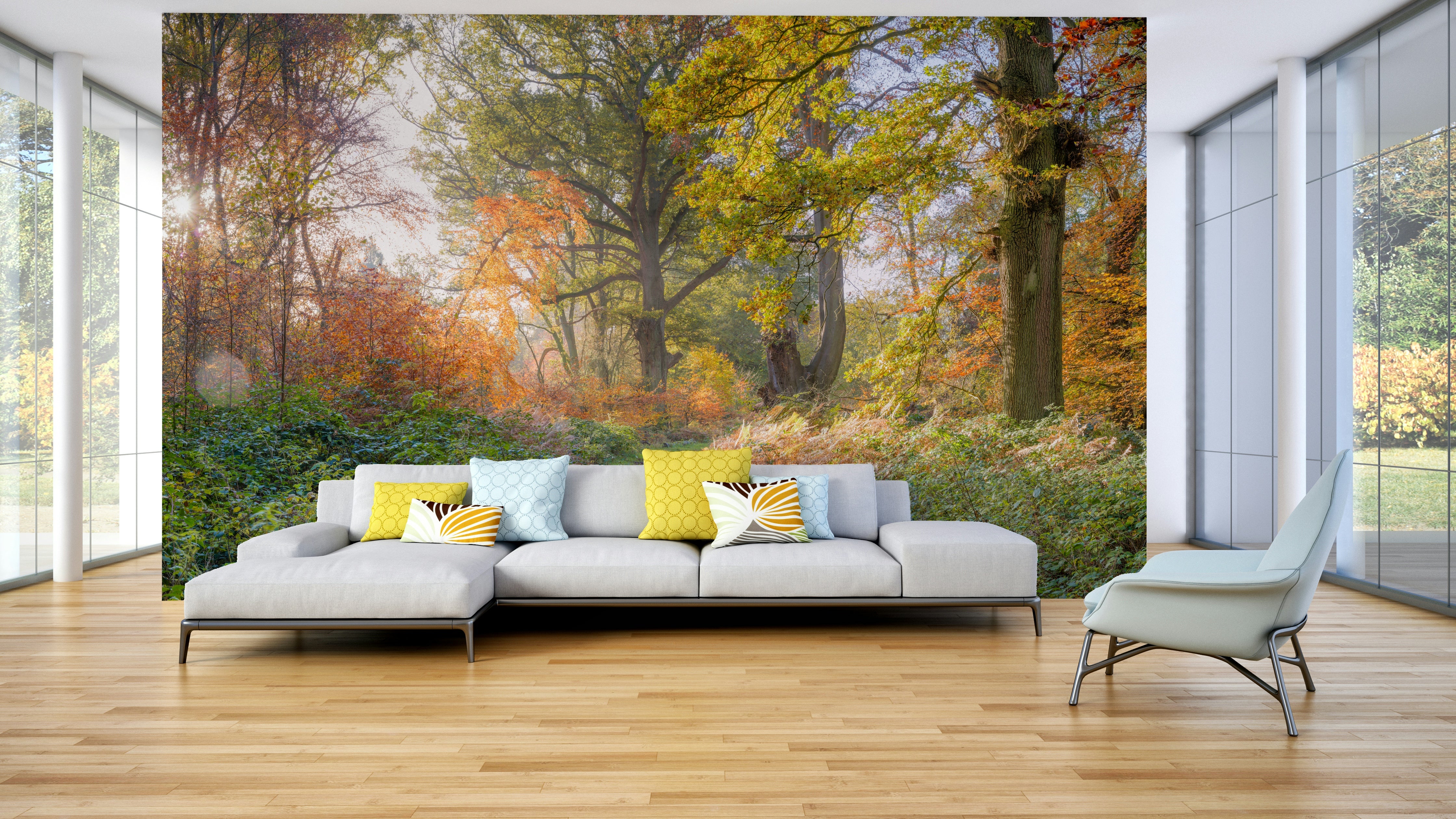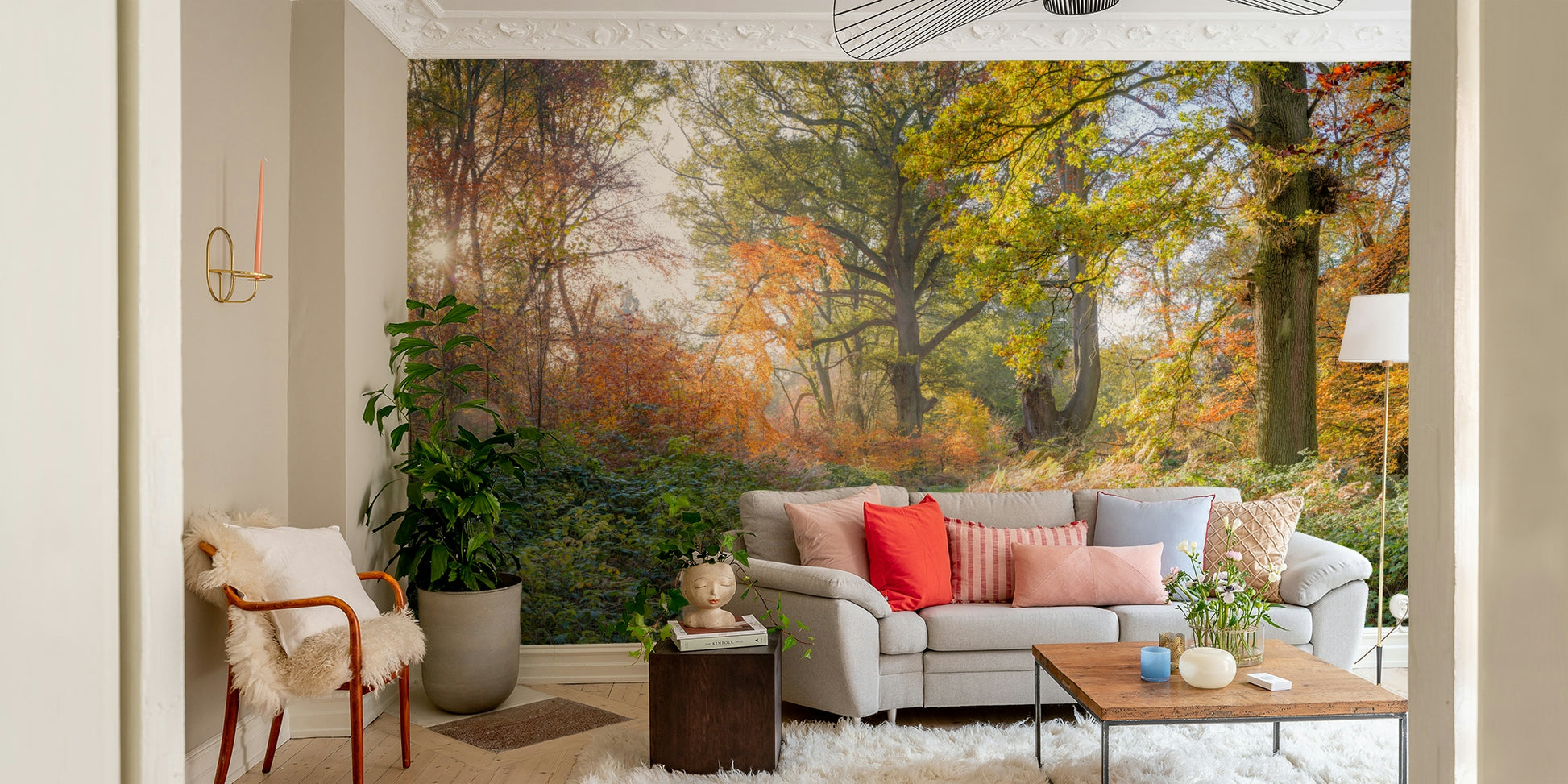 Adorn your home with the breathtaking beauty of our Vibrant Fall Pathway Wall Mural. This captivating mural wallpaper features a picturesque woodland path winding through a forest ablaze with the radiant colors of autumn. The scene is filled with lush foliage in brilliant shades of gold, orange, and red, bathed in soft, inviting sunlight that filters through the trees. It's an ideal wallpaper for walls to introduce unique character and a profound sense of natural splendor and peaceful serenity to any room. Its rich colors and inviting composition offer a compelling backdrop, ensuring your home feels both vibrant and beautifully connected to the comforting embrace of the fall season. This art piece is an ideal choice for a harmonious and inspiring home.