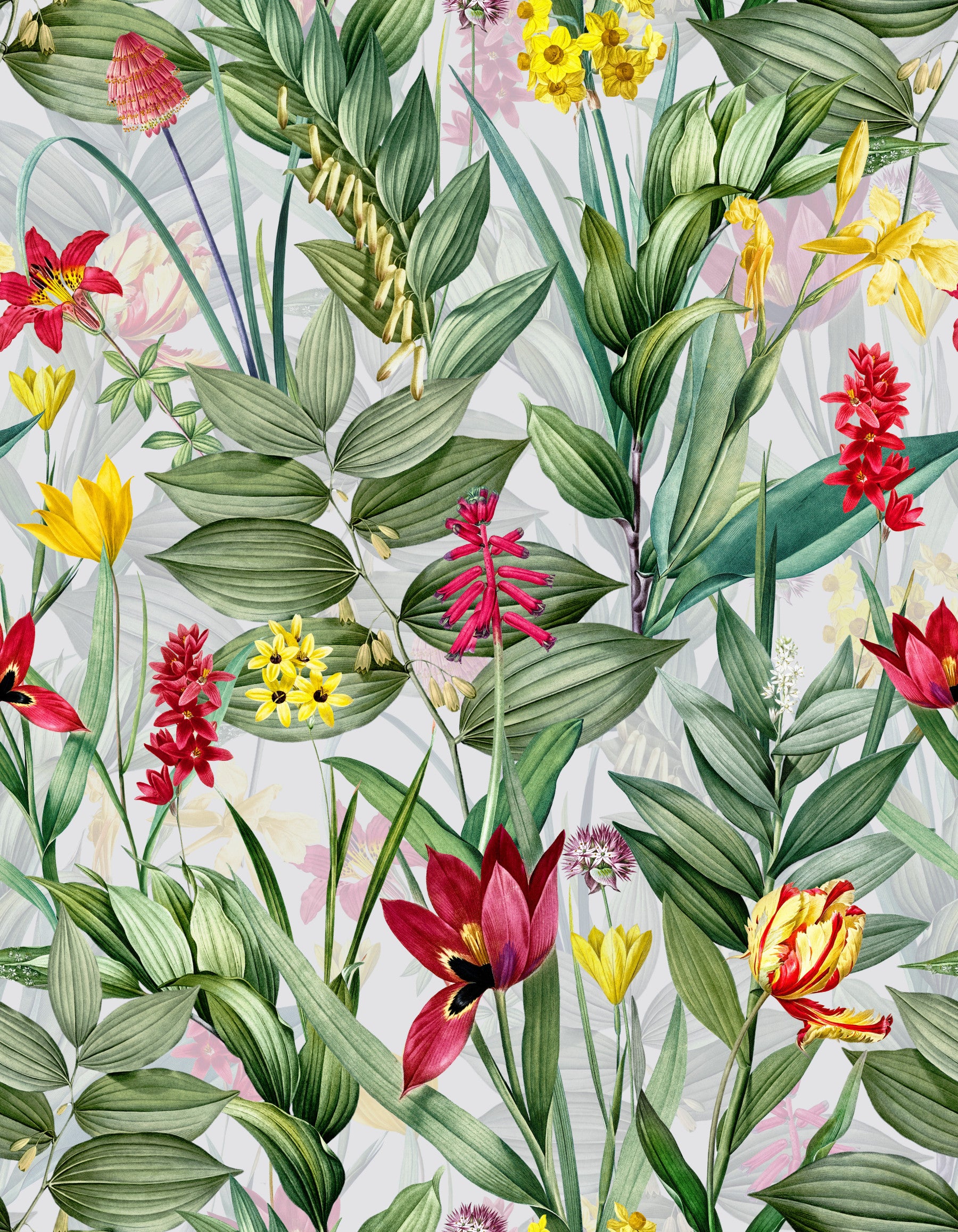 Awaken your senses with 'Vibrant Garden Bloom,' a wallpaper bursting with the rich hues of a flourishing garden. Delicate watercolor renderings of tulips, lilies, and an array of wildflowers dance across a soft, neutral background. The lush green foliage complements the bold flower colors, creating a dynamic yet balanced visual tapestry. This wallpaper's detailed botanical artwork brings a sense of life and energy to any room. The seamless pattern ensures a beautiful, flowing design, adding a vibrant and uplifting touch to your interior.
