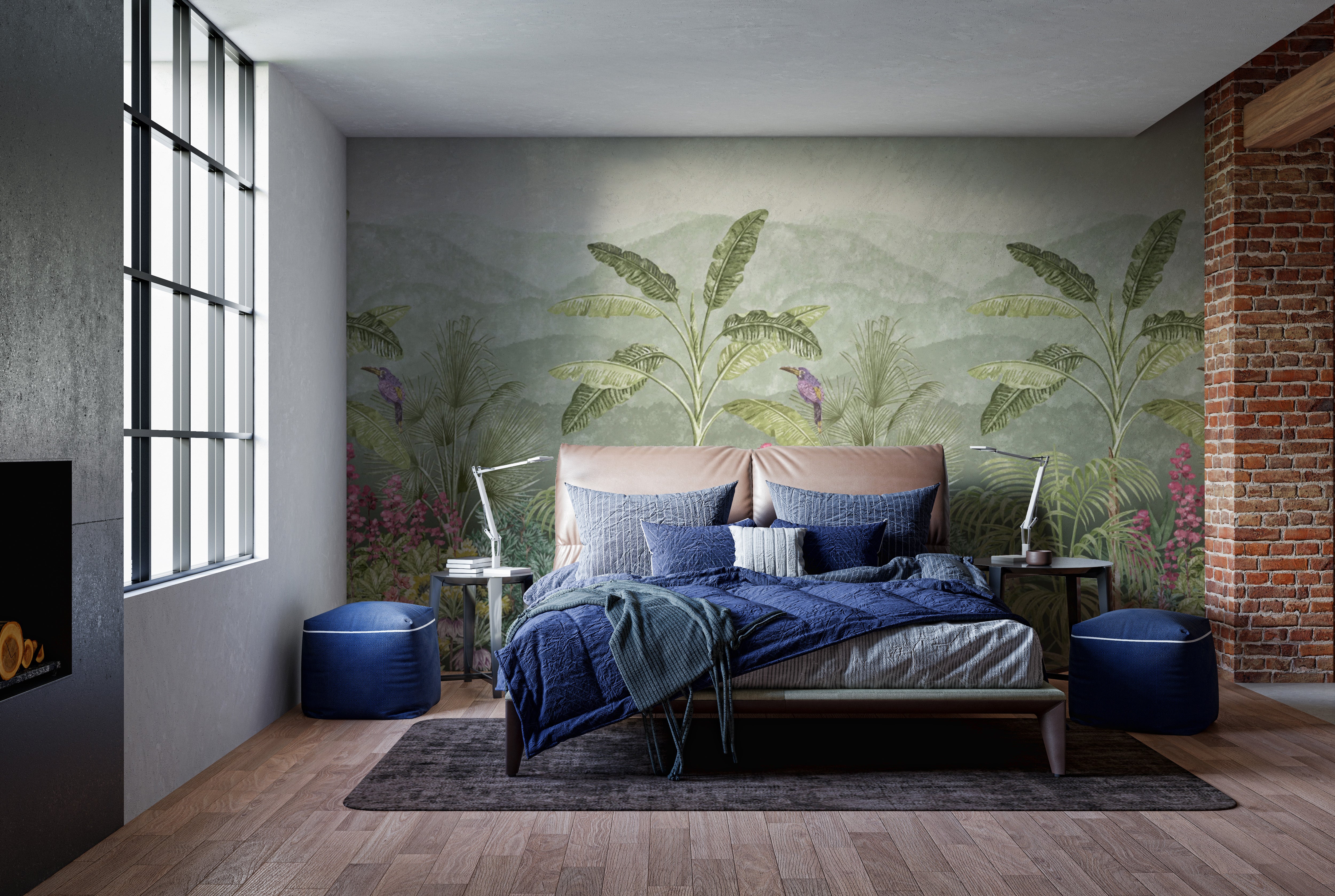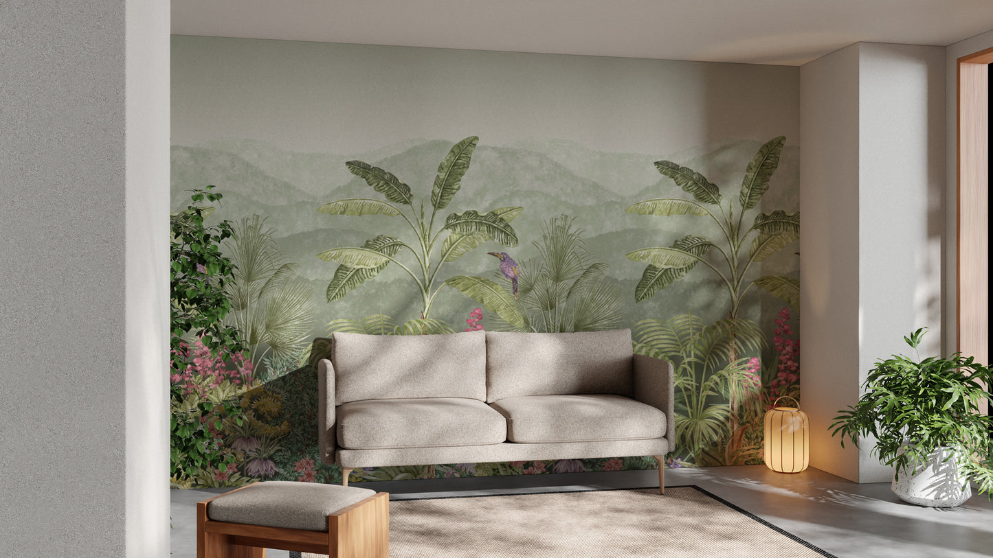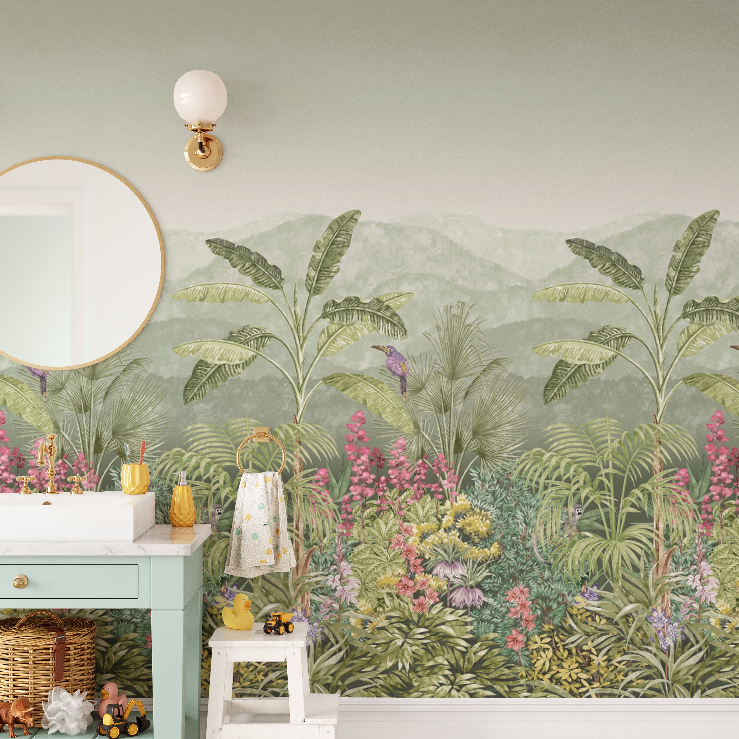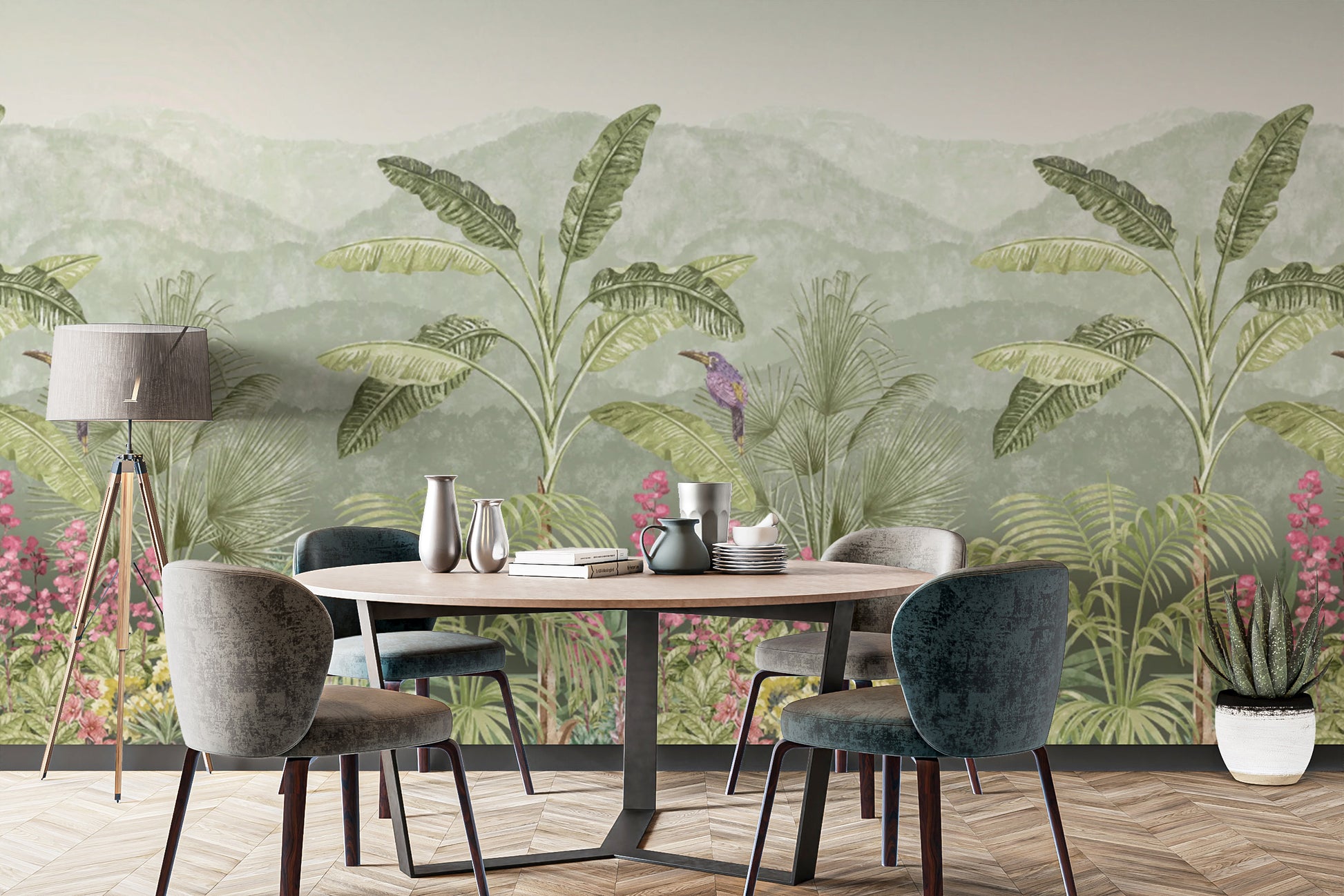 Bring vibrant nature indoors with the tropical jungle botanical wallpaper featuring lush greenery, palm trees, and colorful exotic flowers. This tropical jungle wallpaper mural showcases rich green foliage paired with pink, purple, and yellow blooms, creating a bold, nature-inspired statement. Birds perched among the leaves add a lively touch, while misty mountains in the background provide depth and dimension. This exotic botanical wall mural complements bright and neutral color schemes, perfect for tropical, bohemian, or eclectic interiors. It's a striking way to highlight the natural beauty in any space, ideal for living rooms, bedrooms, or feature walls.