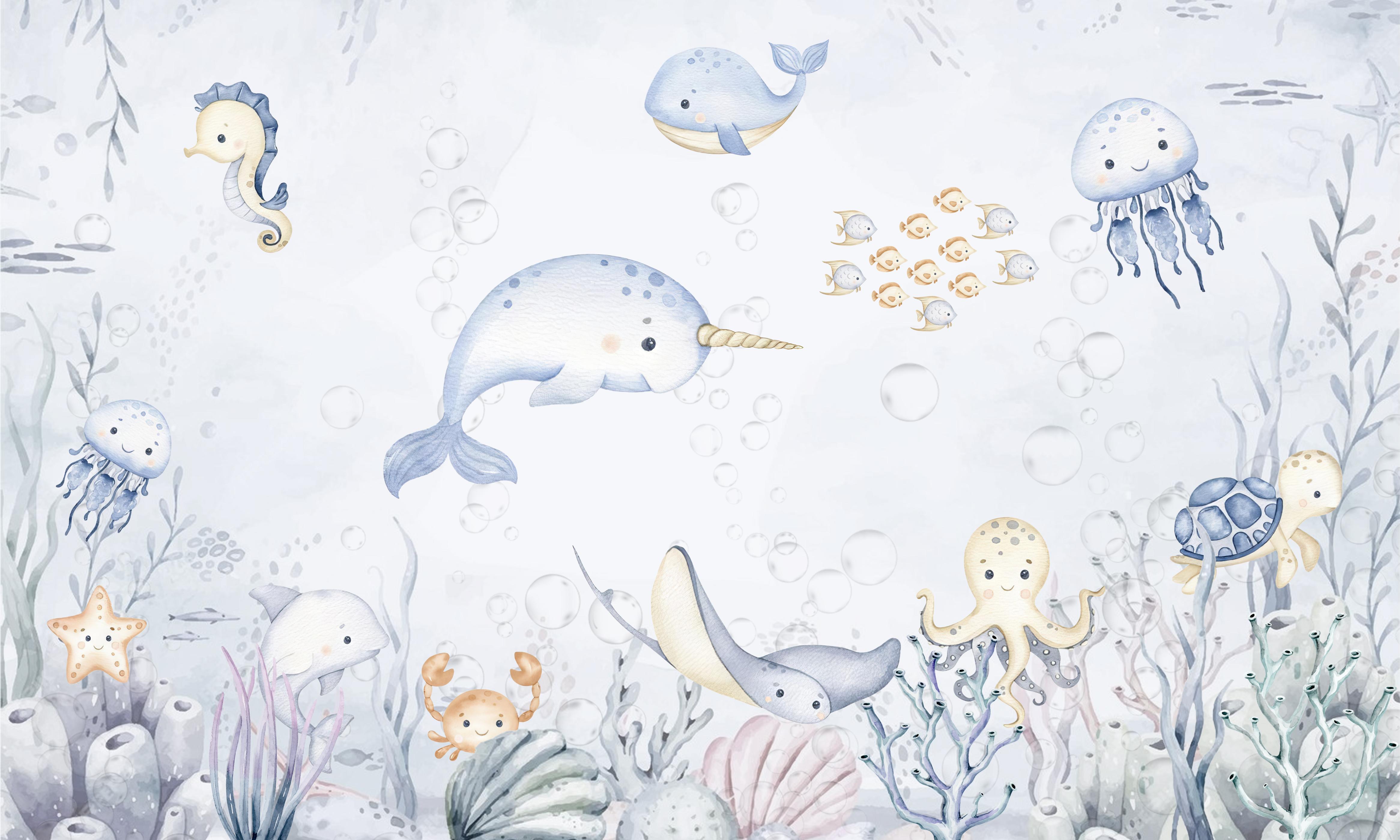 Turn your child’s room into an underwater wonderland with this adorable Vibrant Underwater Fishes Wall Mural. Featuring friendly sea creatures like narwhals, whales, turtles, jellyfish, and playful fish, this charming fish wallpaper adds a cheerful marine touch. Soft pastel shades and hand-drawn illustrations create a calming and fun vibe, perfect for nurseries, playrooms, or kids' bedrooms. The detailed underwater plants and bubbly background offer a gentle ocean feel without overwhelming the space. Whether your little one loves sea life or just enjoys playful designs, this mural brings joy and creativity to everyday walls while keeping things light and easy on the eyes.