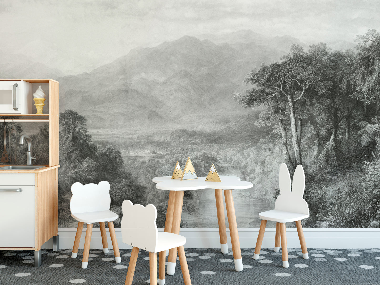 Update the look of your room with the vintage black-white landscape wallpaper, which carries a complex grey-scale landscape scene that possesses grace and class. This traditional scene mural creates stunning views of mountains, forests, and waterfalls in the look of woodcut, ideal as an interior decoration with space and grace. Whether enhancing a living room, study, or office, this antique nature artwork wallpaper blends effortlessly with both modern and traditional decor. Up your walls with this artful forest depiction wallpaper and add timeless charm to a historic scenic landscape to your home decor. Ideal for those who love vintage-inspired décor.