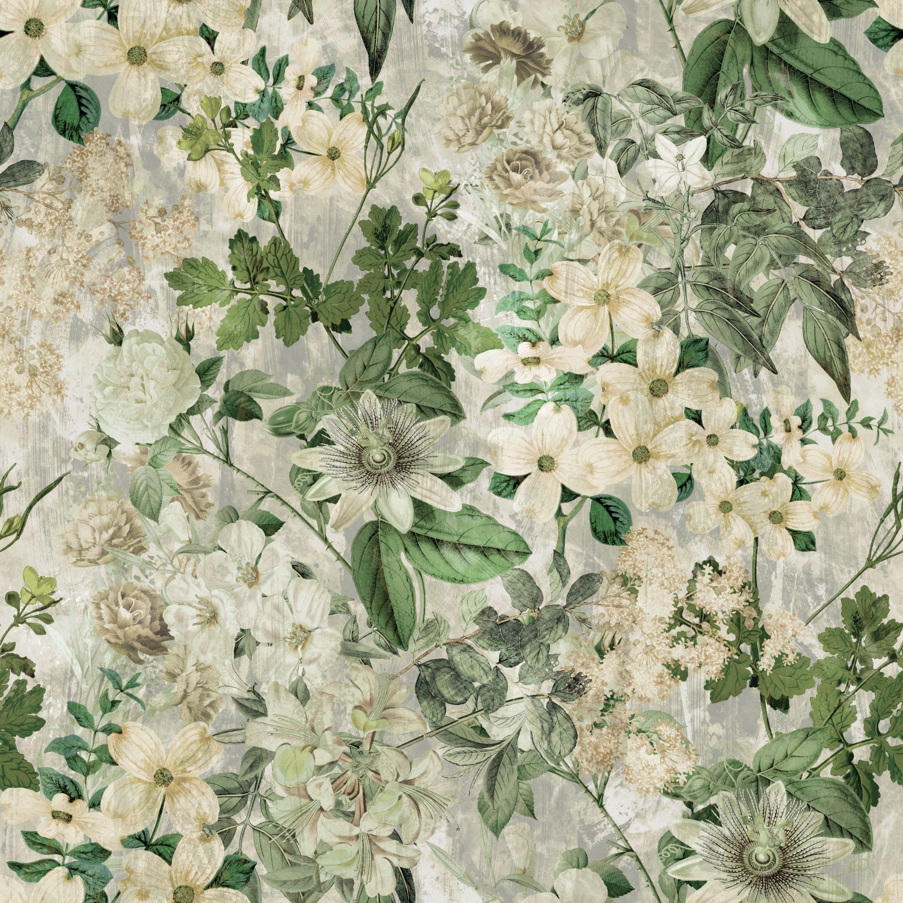 Bring a touch of timeless charm to your home with this floral canvas. It displays flowers and foliage in shades of white, green, and beige, all set against a textured backdrop. This wallpaper for walls has a subtle, aged effect, creating a classic look. Ideal for living rooms, bedrooms, or hallways, this canvas enhances the style and provides a sophisticated yet welcoming look for your wall decor. This design works well with both light and dark interiors.