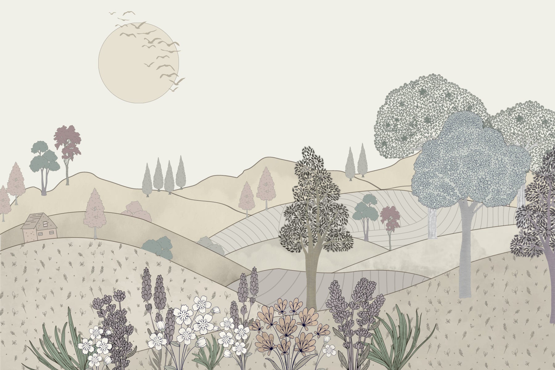 Embrace the calming elegance of the Bloomscape vintage-inspired scene. This wallpaper for walls adds timeless beauty to any space. Rolling hills, soft colours, and wildflower meadows create a peaceful atmosphere. Gentle tones of blush pink, green, and lavender provide a warm, inviting ambiance. Perfect for bedrooms, living rooms, or studies. The design creates a sophisticated yet relaxing retreat in your home.