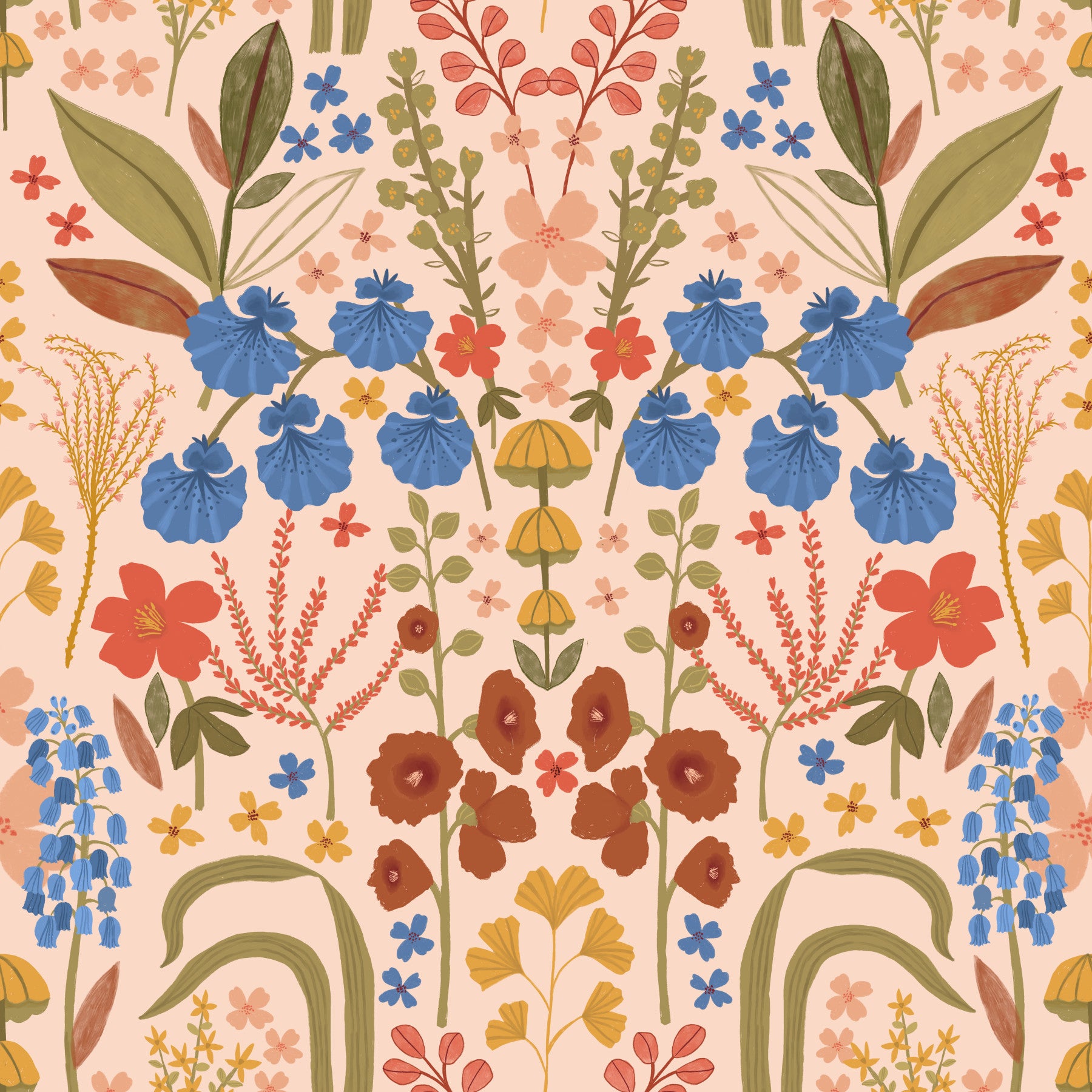 Embrace the charm of springtime with this delightful 'Vintage Bluebells - Cream' wallpaper. A soft, cream background provides the perfect canvas for a captivating array of stylized floral elements. Vibrant bluebells take center stage, complemented by a harmonious palette of warm oranges, muted reds, and golden yellows. The hand-drawn aesthetic lends a touch of vintage elegance, creating a design that's both modern and reminiscent of classic botanical illustrations. This wallpaper evokes a sense of calm and tranquility, bringing a touch of natural beauty to any digital device.