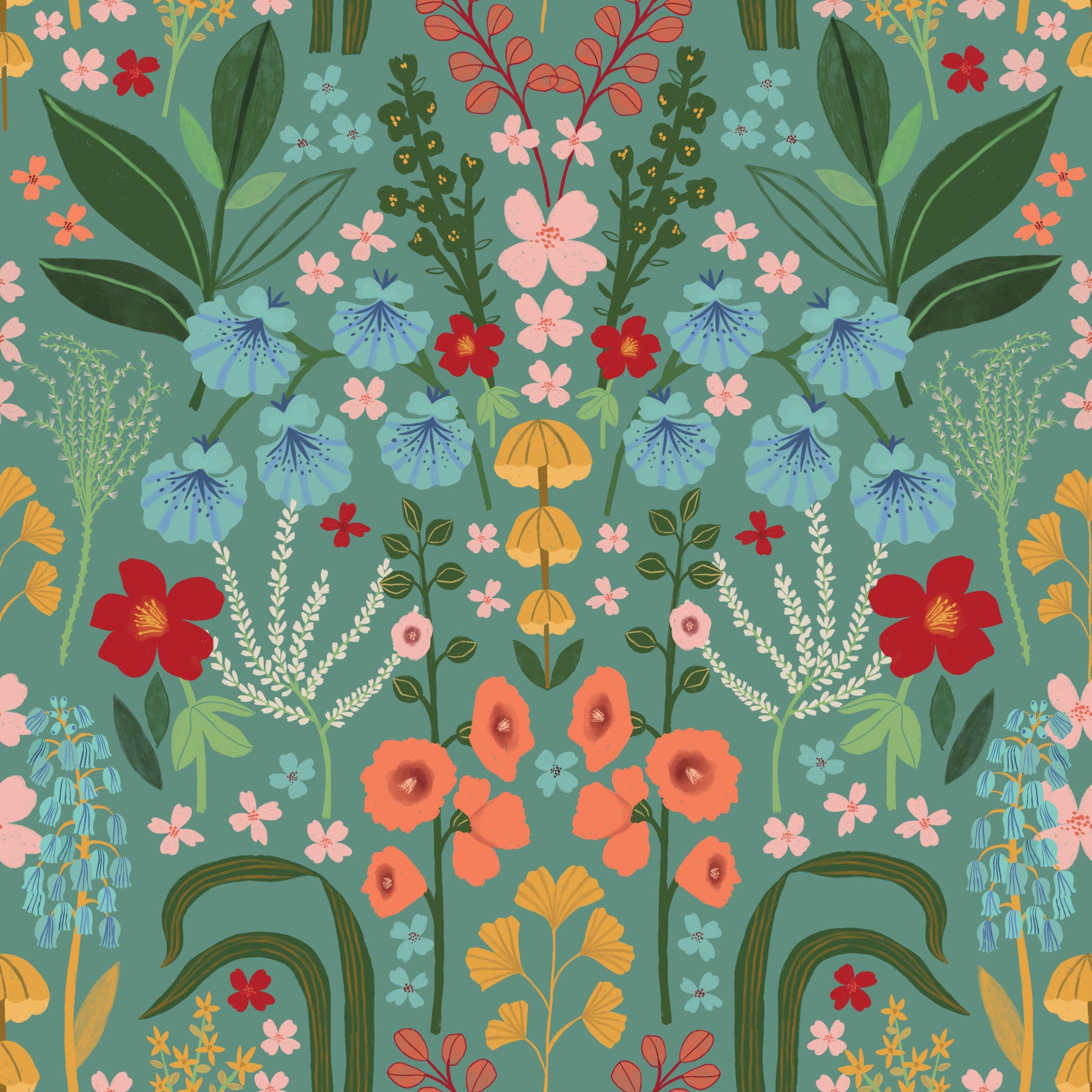 Step into a whimsical garden with our "Vintage Bluebells" wallpaper. This enchanting design showcases a captivating array of stylized flora against a calming teal backdrop. Vibrant bluebells, delicate pink blossoms, and rich red flowers are artfully arranged in a symmetrical pattern reminiscent of vintage botanical illustrations. Touches of yellow mushrooms and ginkgo leaves add unexpected depth and charm. The hand-painted aesthetic evokes a sense of nostalgia and tranquility, making it the perfect addition to any space seeking a touch of elegant, nature-inspired style. This wallpaper is a celebration of springtime beauty, captured in a uniquely artistic and timeless fashion.