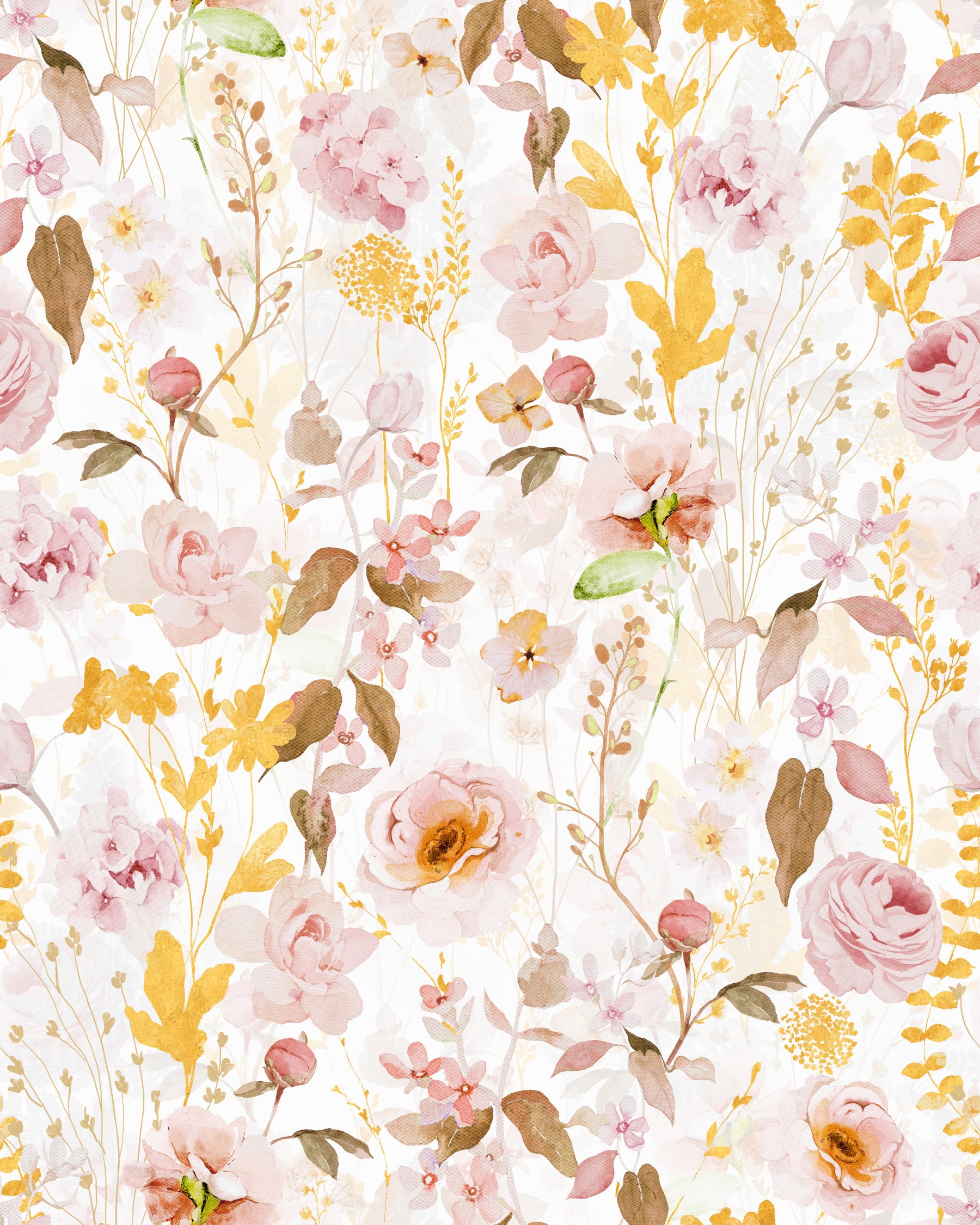 Adorn your walls with this enchanting floral wallpaper by Uta Naumann for walls, featuring a delicate array of roses, leaves, and botanical elements. The design shows a watercolor style, offering a soft touch of nature. Dusty rose and gold work together to create an elegant, dreamy atmosphere. Ideal for bedrooms, living rooms, or dining spaces, this wallpaper adds a touch of charm to any room. The warm tones complement traditional and modern interiors.