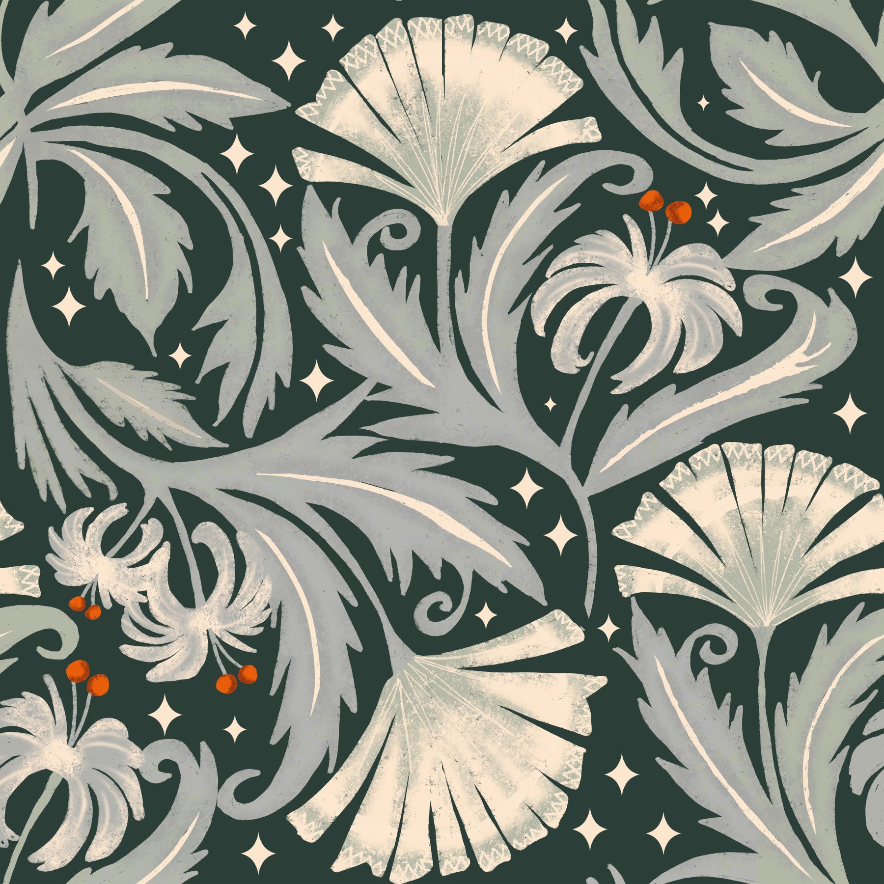Embrace the enchanting allure of 'Vintage Botanica Forest Noir,' a heritage revival floral wallpaper. Elegant, stylized botanicals in muted sage and cream hues dance across a deep emerald green backdrop, creating a sophisticated and moody atmosphere. Intricate leaf patterns and fan-like flowers, reminiscent of antique illustrations, are subtly textured, adding depth and visual interest. Scattered starbursts add a touch of magic, enhancing the wallpaper's dreamy, nocturnal quality. This design perfectly balances vintage charm with a modern, minimalist aesthetic, ideal for adding a touch of refined elegance to any space.