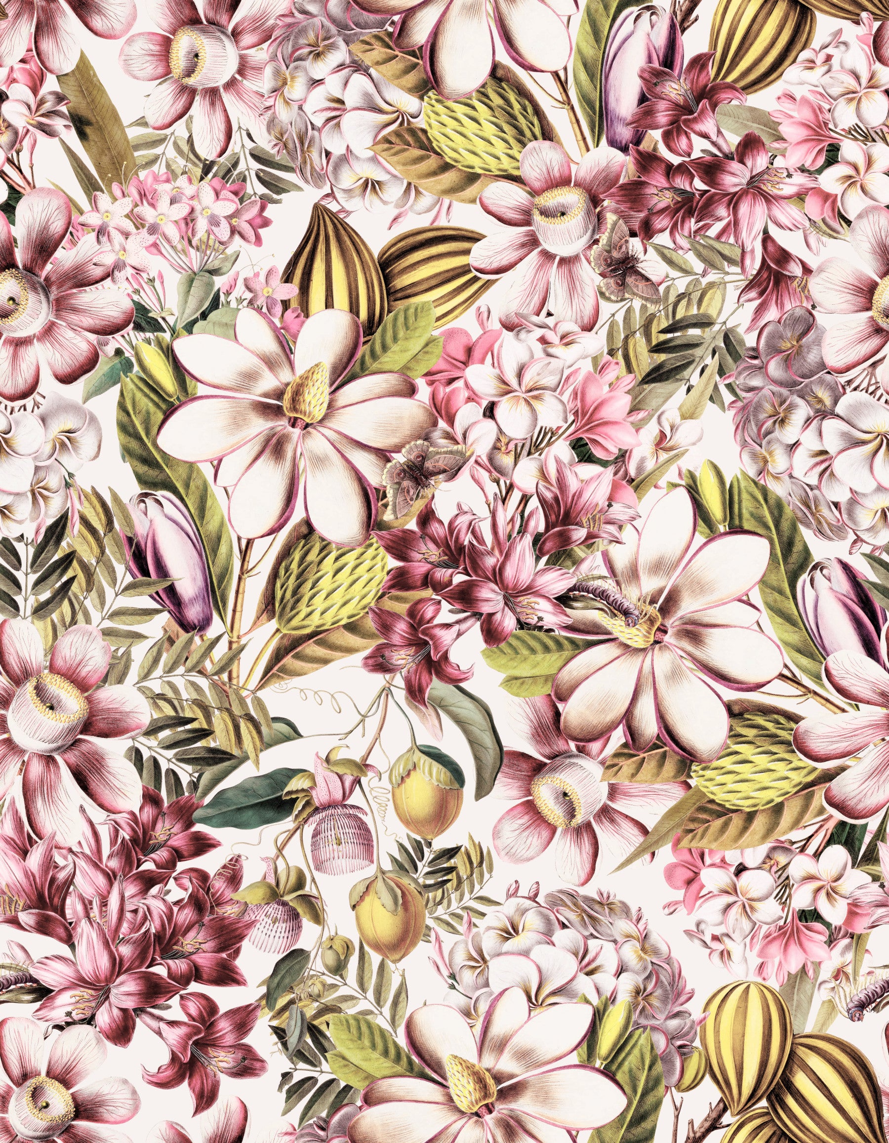 Step into a world of timeless elegance with this "Vintage Botanical Garden" wallpaper. A captivating array of meticulously rendered flowers and exotic fruits creates a lush, romantic atmosphere. Delicate pinks and creamy whites blend harmoniously with rich greens and muted yellows, evoking the charm of a bygone era. The detailed botanical illustrations, reminiscent of antique prints, showcase a diverse collection of blossoms, from large, showy magnolias to clusters of delicate pink blooms. This wallpaper is a perfect choice for adding a touch of refined natural beauty to any space, transforming it into a tranquil haven inspired by a classic botanical garden.