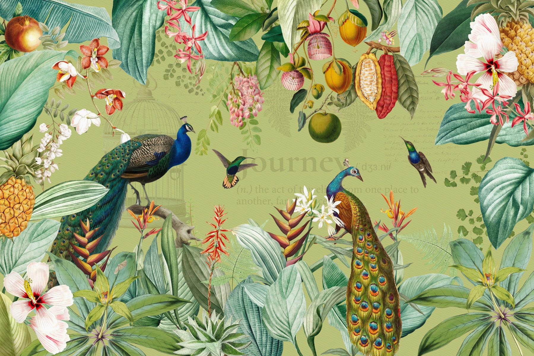 Escape to a serene paradise with this exquisite wallpaper. Rich, detailed botanical illustrations showcase vibrant peacocks amidst a profusion of lush tropical plants and exotic fruits. The vintage-inspired artwork evokes a sense of old-world charm, while the lively colors and intricate details create a captivating visual experience. The soft olive-green background lends an air of tranquility, making this wallpaper ideal for creating a relaxing and inspiring atmosphere in bedrooms, living rooms, or any space needing a touch of exotic elegance.