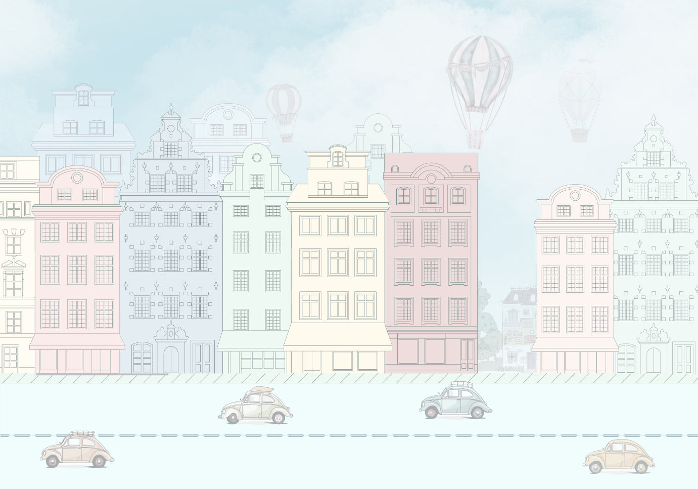 Step back in time with our Vintage Boulevard Wallpaper Mural, a mesmerizing piece of vintage wall art that transforms any room into a picturesque pastel-hued street. Ideal for sparking young imaginations, this classic wall mural features whimsical scenes of hot air balloons floating over quaint, detailed facades reminiscent of a gentler time. Perfect as a retro street mural for a child's room, it invites tales of gentle adventures along its timeless streets. Each vintage car and charming building serves as the setting for cherished stories, making this antique street art more than just decor—it's a gateway to a world of playful afternoons and storytelling. Enhance your home with this historic wall mural, where every day promises a delightful journey through a softer, more colorful world. Shop now and let the Vintage Boulevard inspire curiosity and wonder in your space.
