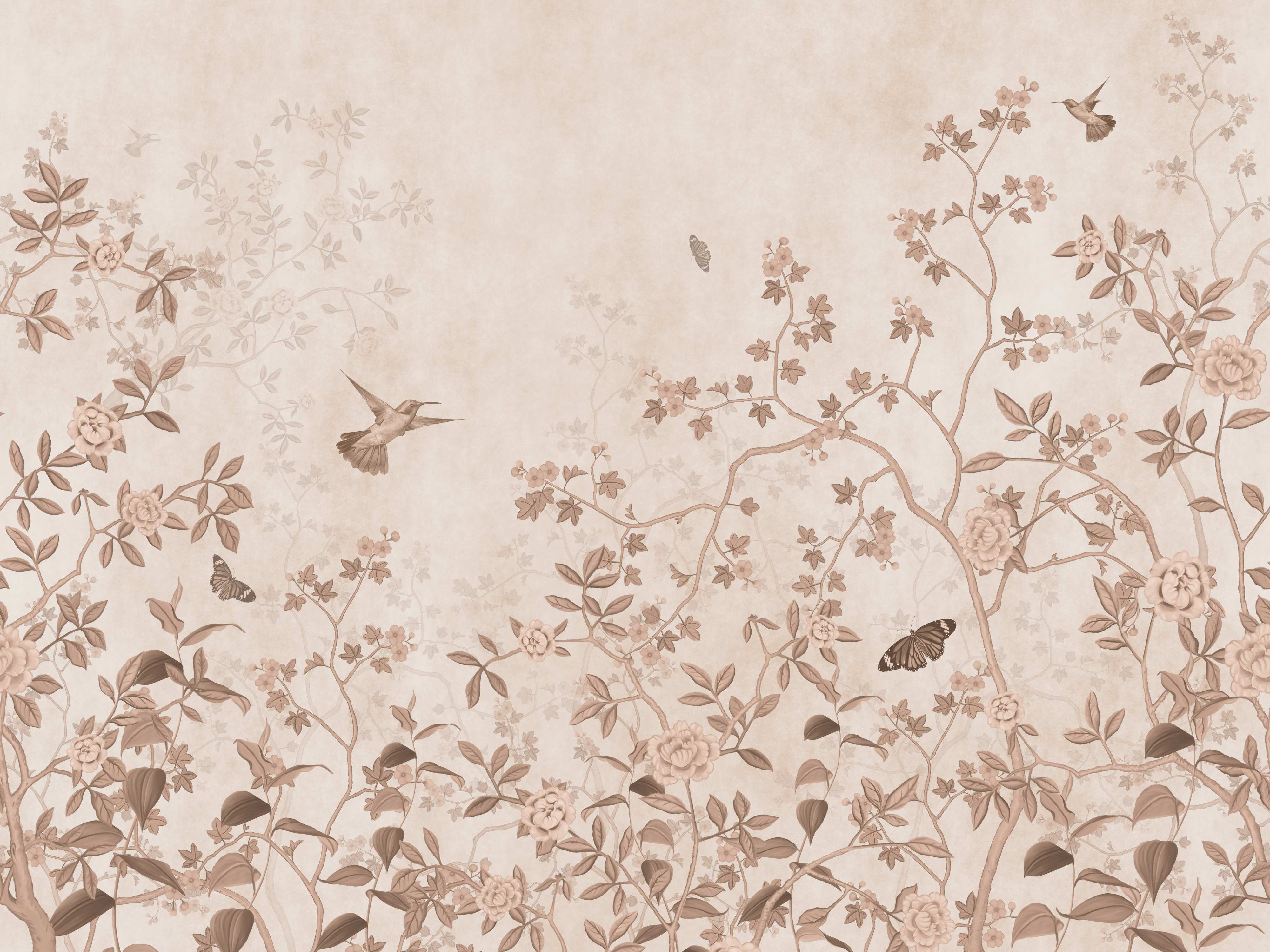 Transform your space with the vintage chinoiserie floral wallpaper mural, a timeless blend of elegance and nature. Featuring delicate botanical wallpaper mural details with graceful hummingbirds, butterflies, and blooming branches, this design exudes sophistication. The antique floral wall mural in soft sepia tones creates a serene ambiance, perfect for living rooms, bedrooms, or dining spaces. Crafted for luxury, this hand-painted flower mural adds a Victorian-style charm to your walls. Elevate your interiors with this classic botanical print wallpaper, ideal for creating a warm and inviting atmosphere. Enhance your home with the beauty of nature-inspired wallpaper today!