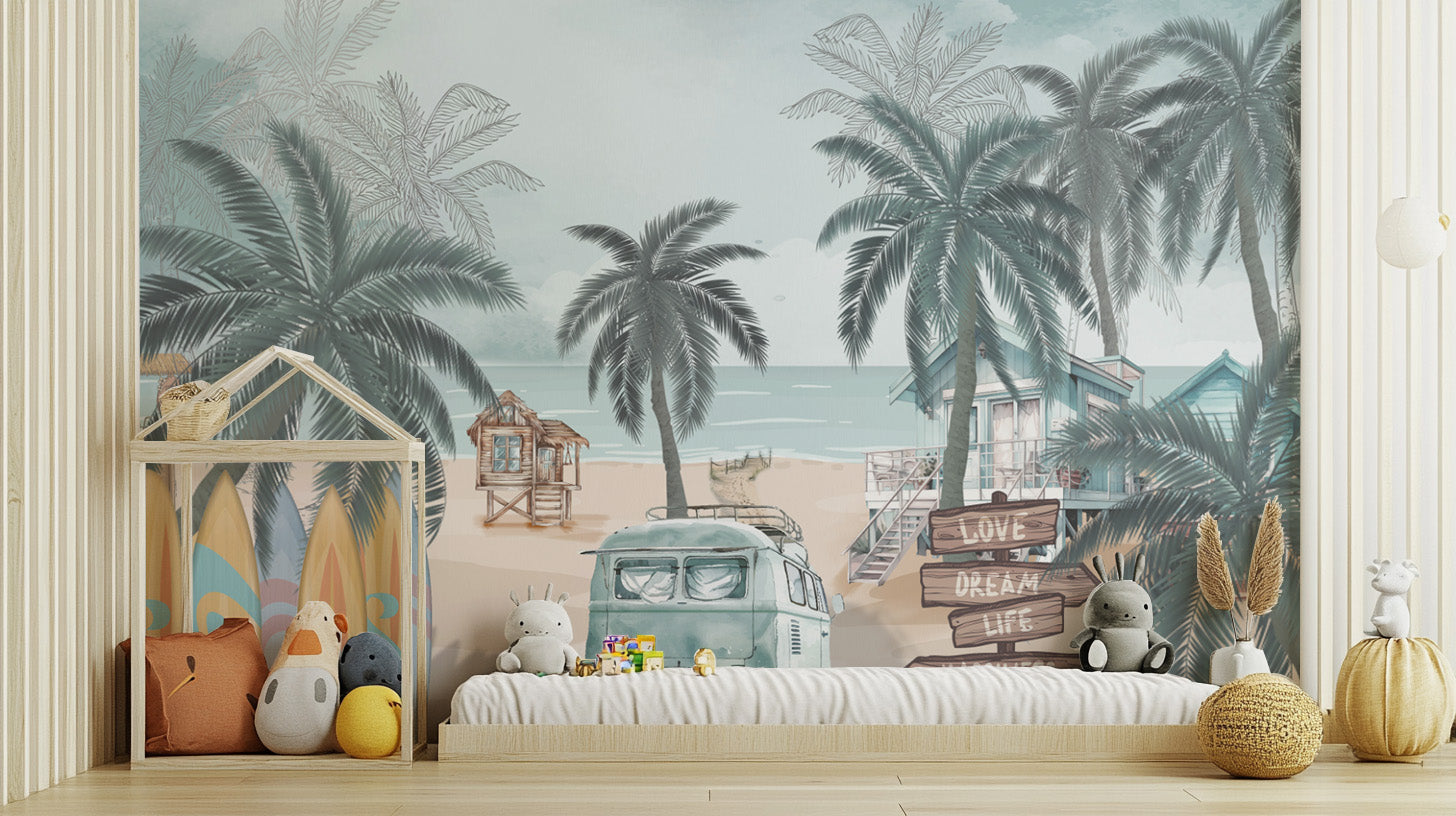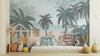 The Vintage Coastal Beach Wallpaper brings a relaxing seaside vibe with hand-drawn palm trees, a retro van, and surfboards resting on soft sand. The pastel blues and sandy beige tones capture the charm of a tropical beach wallpaper, making it perfect for coastal-inspired spaces. A wooden signpost adds a nostalgic touch, enhancing the warmth of a beach house wallpaper for walls. Gentle waves meet the horizon, creating the feeling of a peaceful getaway. This boho beach wall mural blends vintage aesthetics with a carefree summer lifestyle, offering a refreshing coastal look filled with soft ocean breezes and endless adventure.