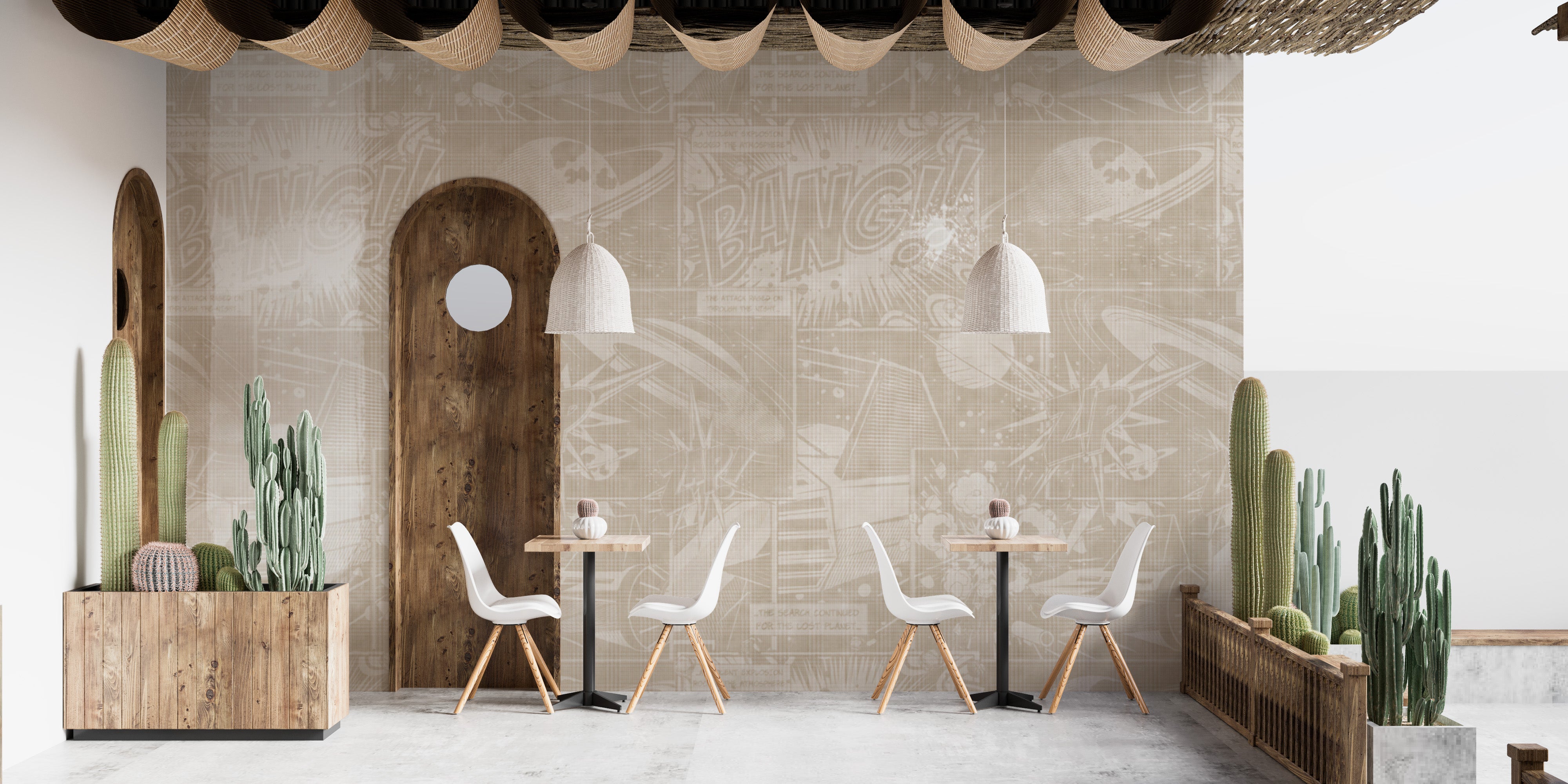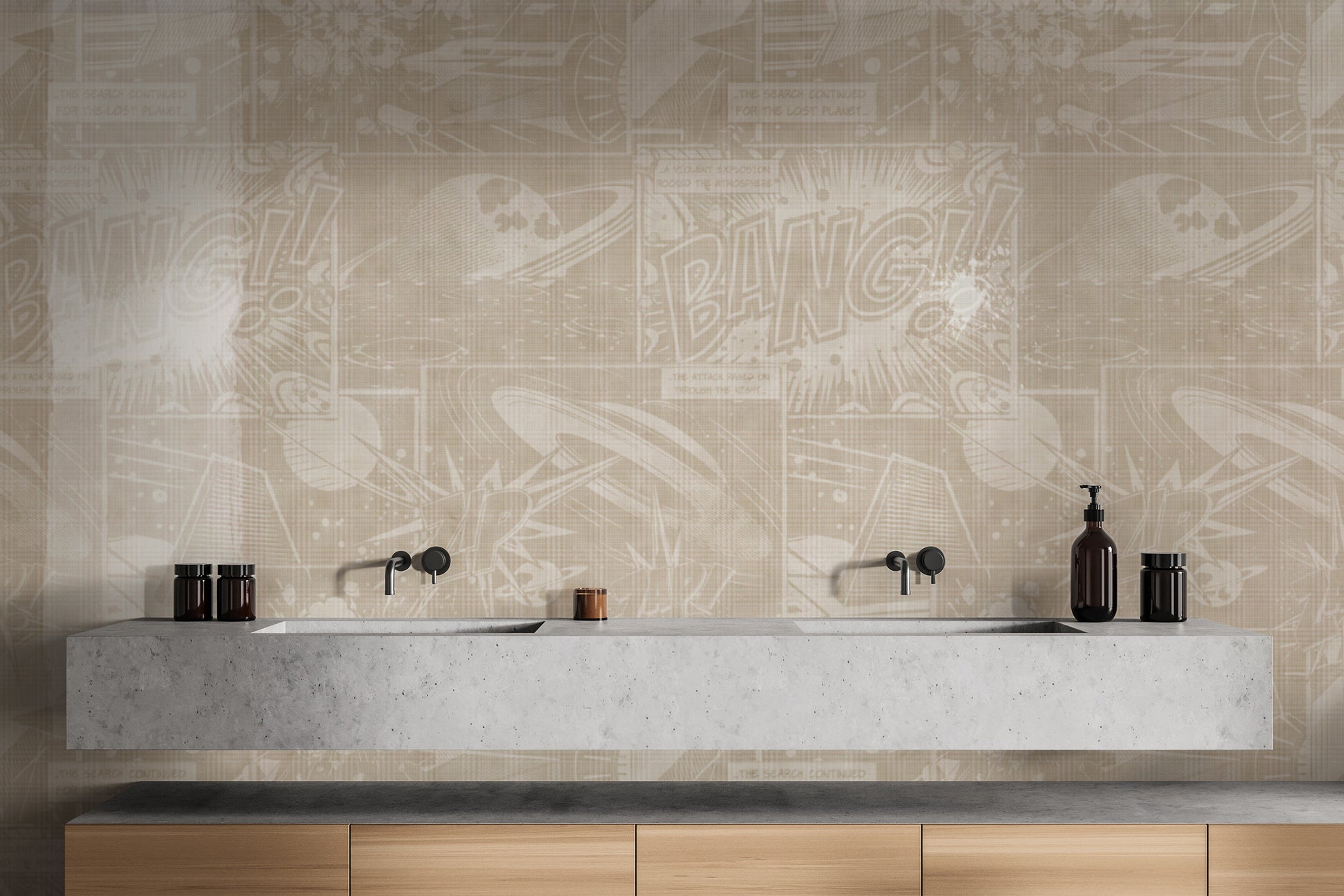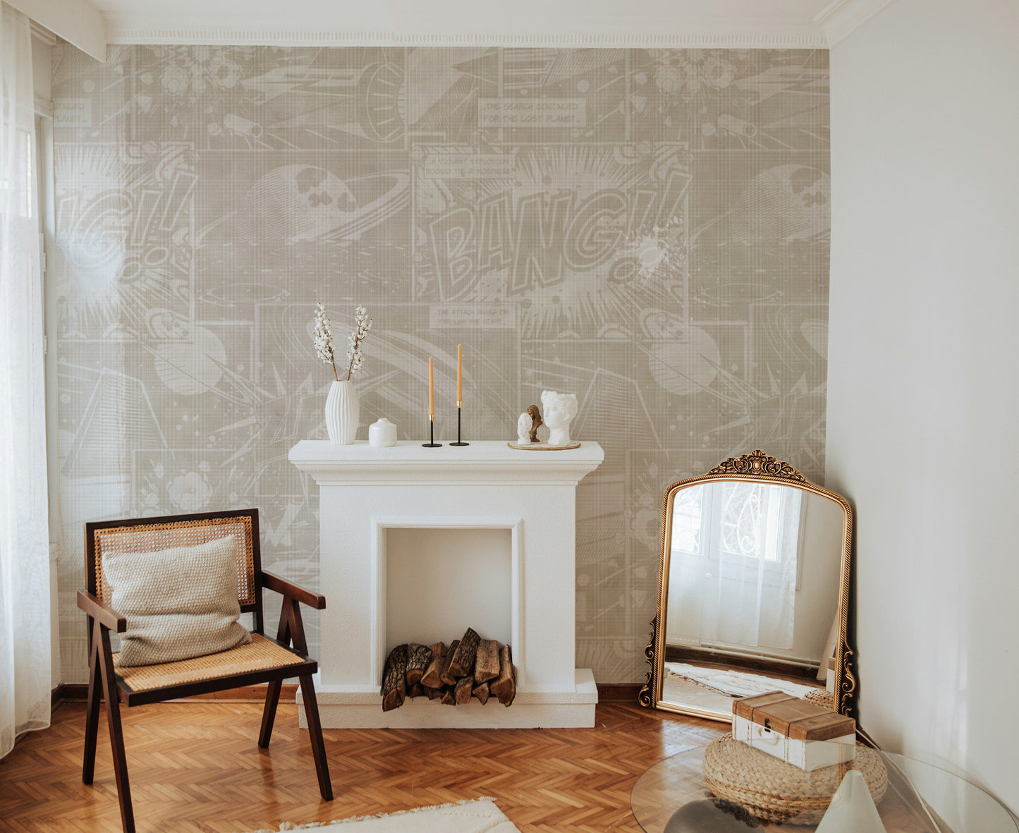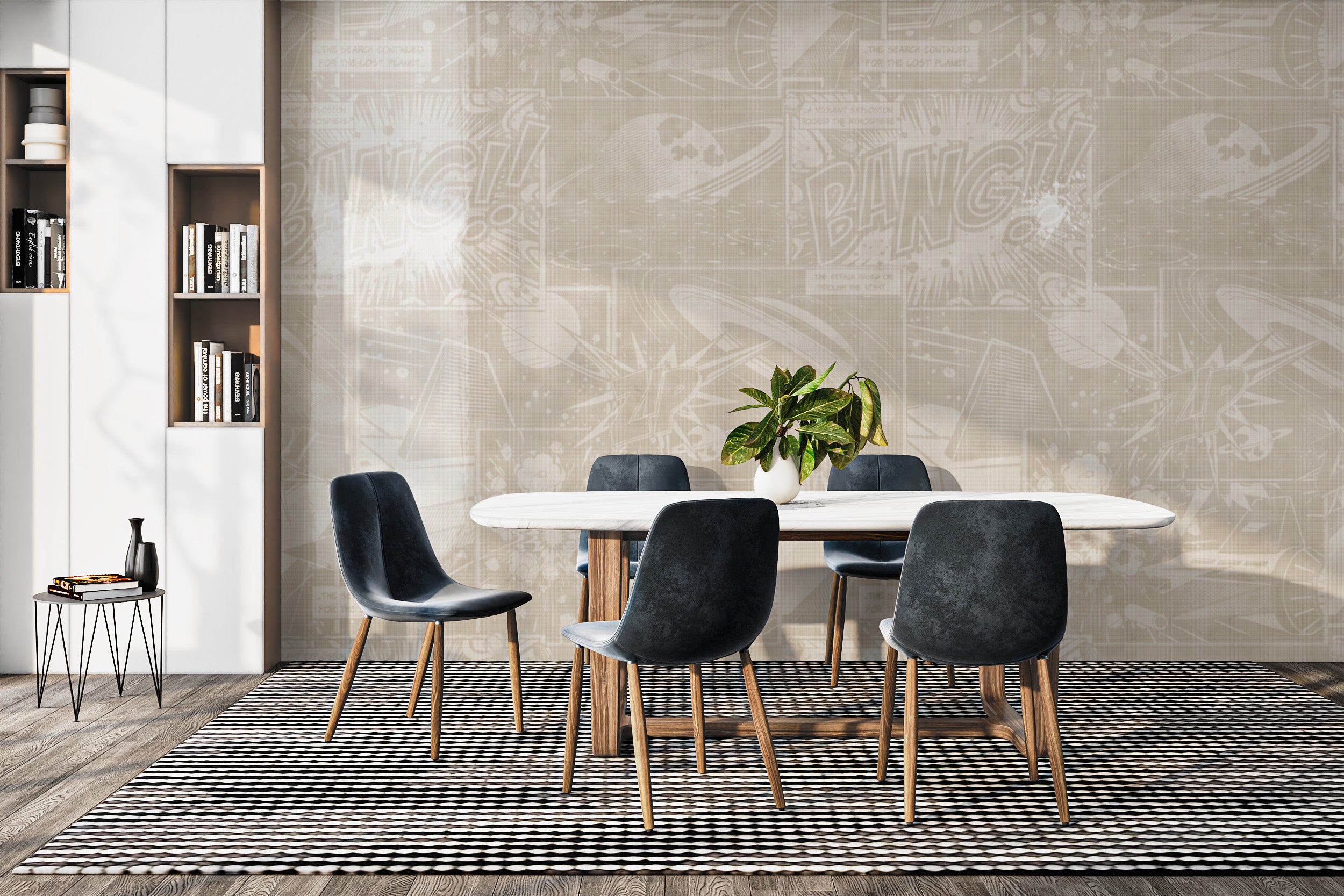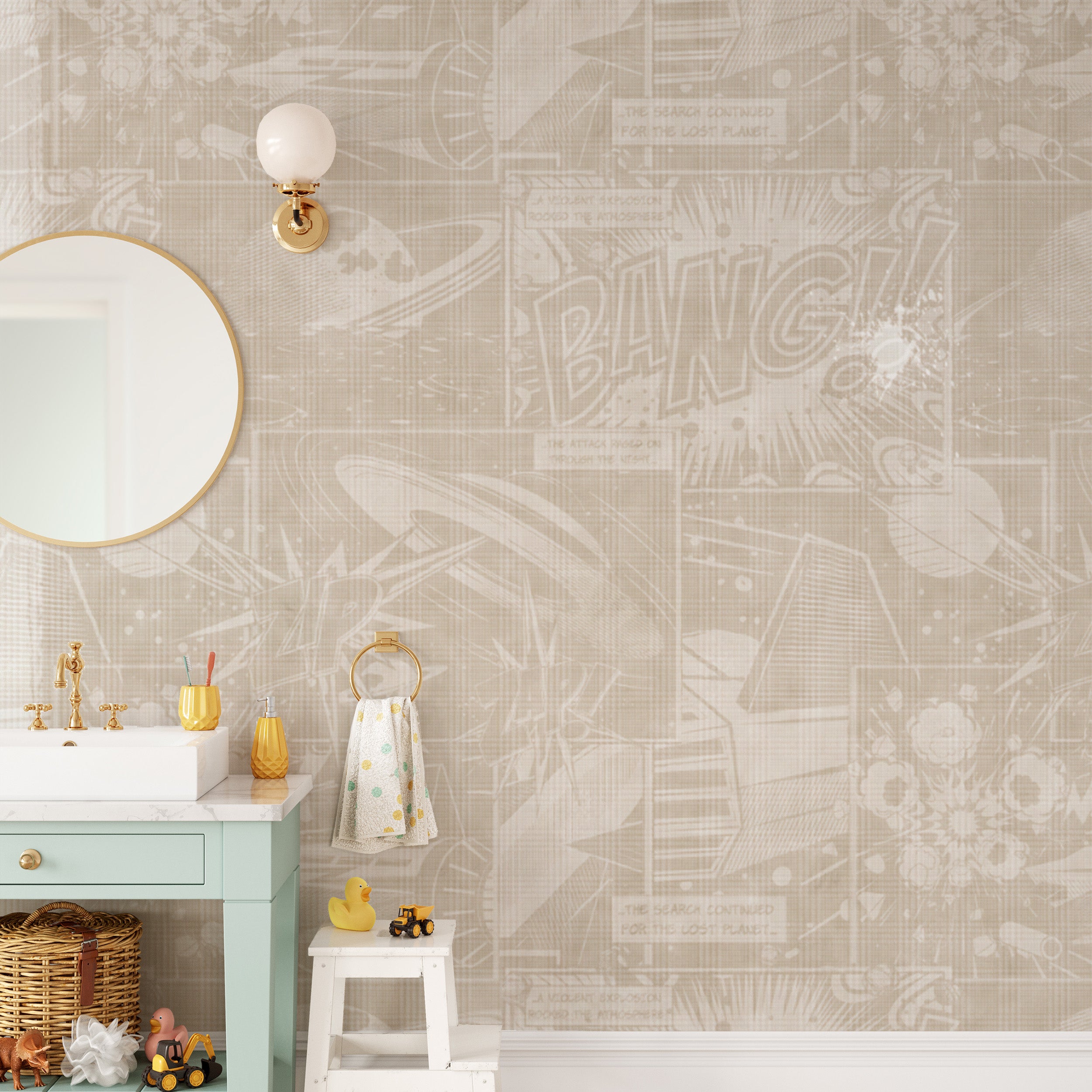 Update your space with the vintage comic space adventure wallpaper, a harmonious mix of retro space wallpaper and traditional comic art. Featuring dynamic comic strip wallpaper patterns with rockets, planets, and bold "BANG!!". Typography: this design creates a nostalgic modern look with a futuristic feel to its interiors. The beige textured wallpaper finish provides a timelessness and is suitable for children's rooms, computer gaming/media centers, or art studios. Augment your interiors with this sci-fi comic wallpaper for those who love space and vintage stuff. This monochrome comic-pattern wallpaper is a real attention-getter!