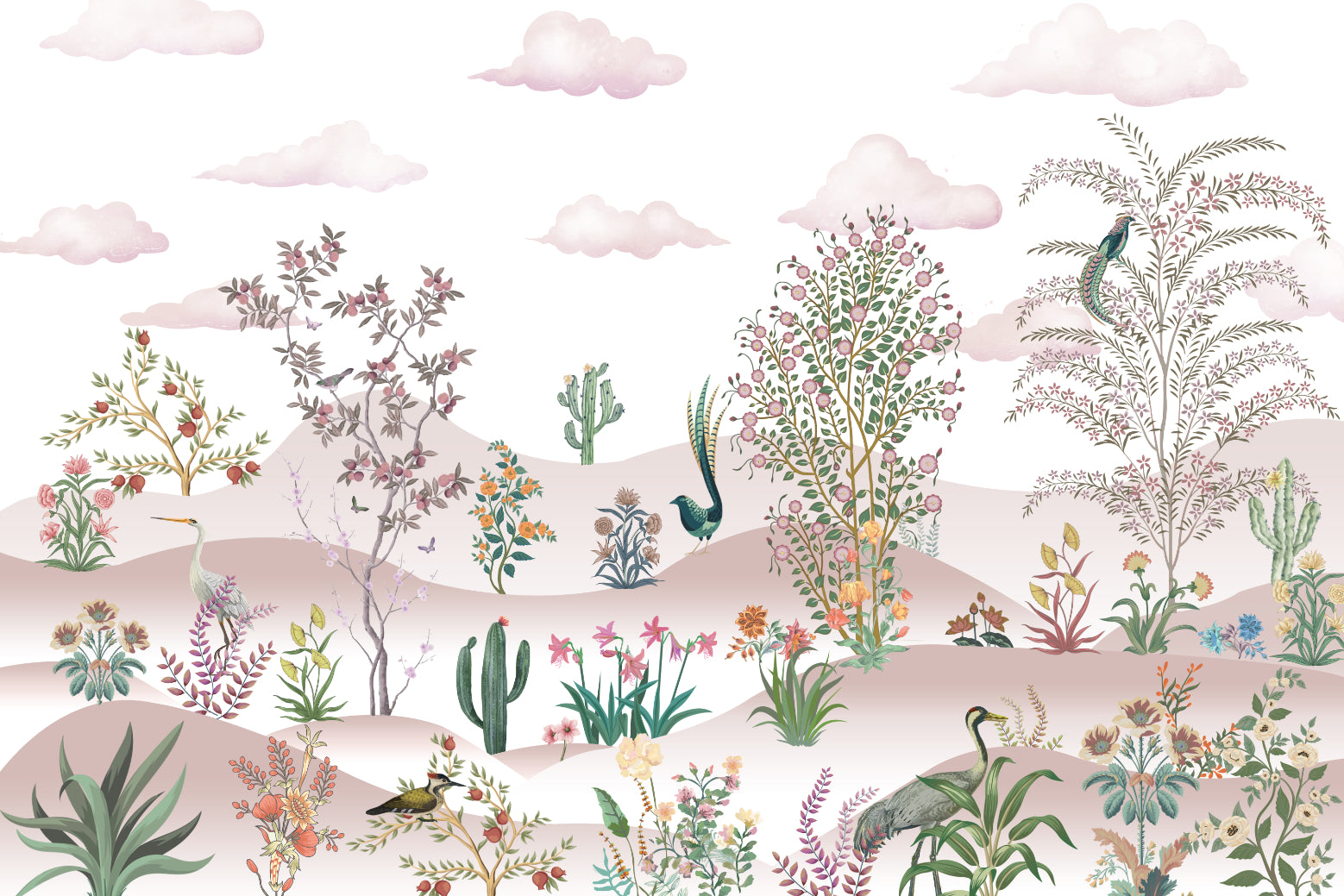 Vintage desert botanical wallpaper mural brings a serene landscape to any room with soft pastel dunes, delicate florals, and exotic birds. The hand-painted watercolor style enhances the beauty of desert flora, including cacti and flowering trees. Elegant peacocks and herons add a touch of nature's charm, creating a peaceful setting. The muted earthy tones blend well with modern and classic interiors. This desert botanical wallpaper suits living rooms, bedrooms, and offices, offering a timeless appeal. The intricate details of floral and fauna wallpaper provide a sophisticated look. Perfect for those who appreciate nature-inspired designs with vintage charm.