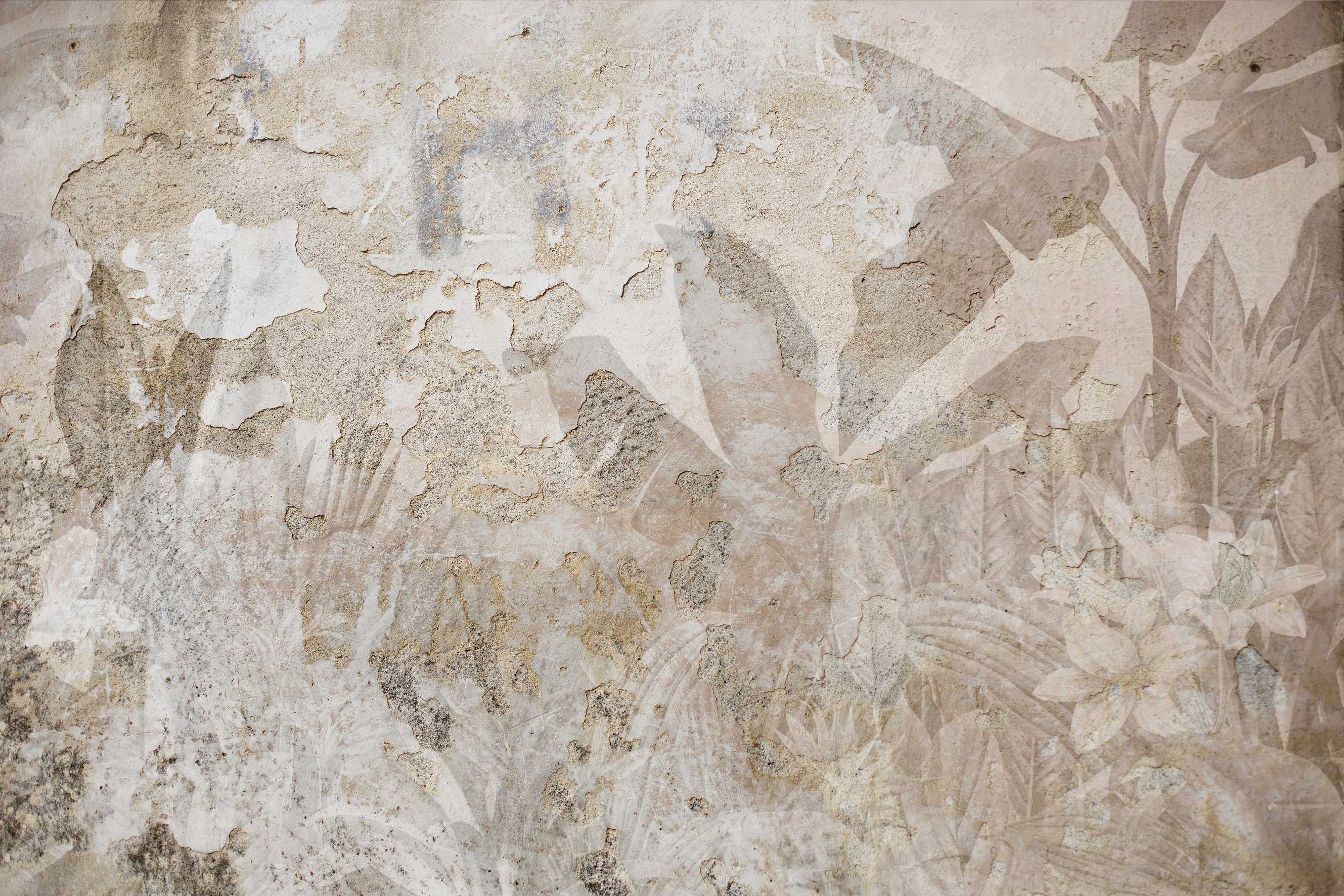 Aged plaster effect wallpaper with botanical accents