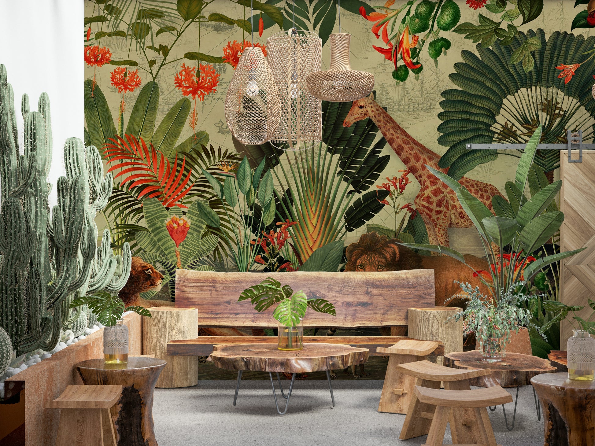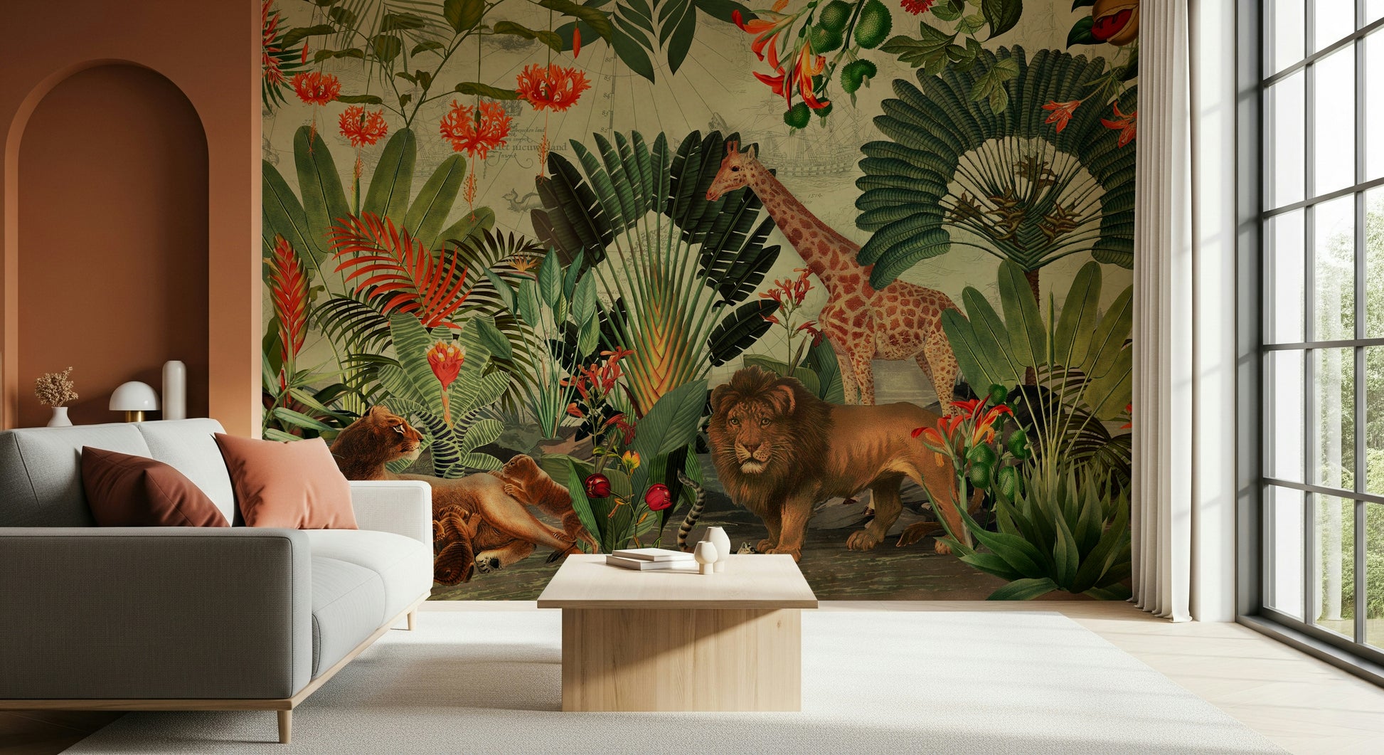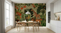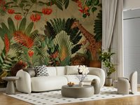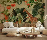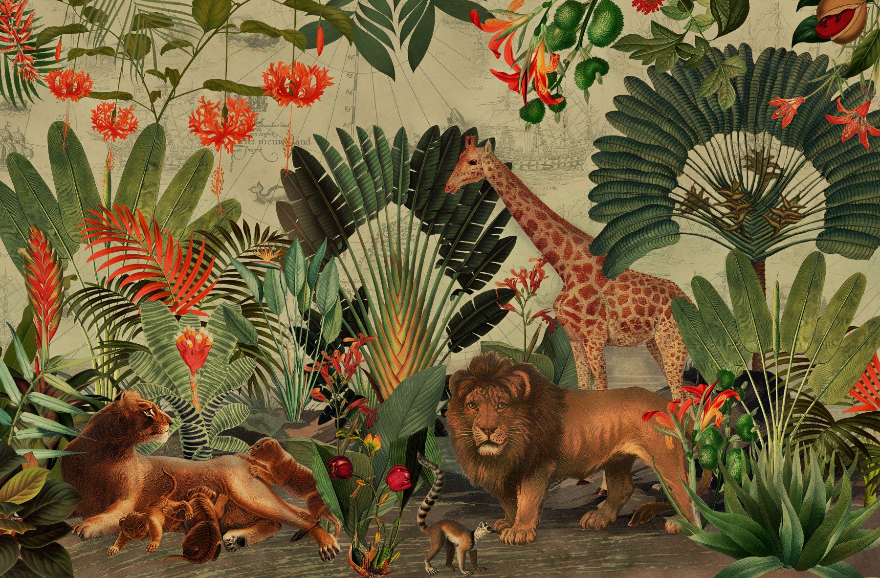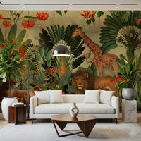 Journey to a hidden world with this breathtaking wallpaper. The design masterfully blends vintage botanical illustrations of vibrant tropical flora and fauna with a faded antique world map, creating a sense of adventure and discovery. A majestic giraffe and a lion family share the scene amongst lush foliage, transporting viewers to an exotic paradise. The detailed artwork invites exploration, while the muted background and warm colour palette create a serene and sophisticated atmosphere. Perfect for adding a touch of elegance and intrigue to any room, this wallpaper is a captivating blend of nature's beauty and historical exploration.