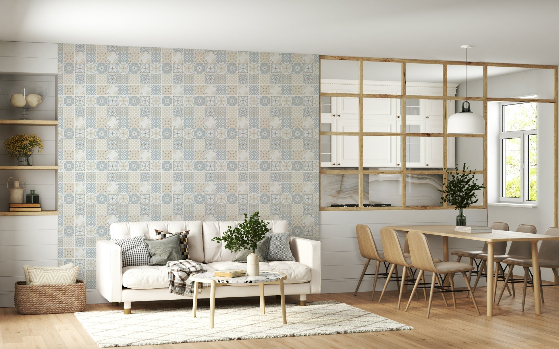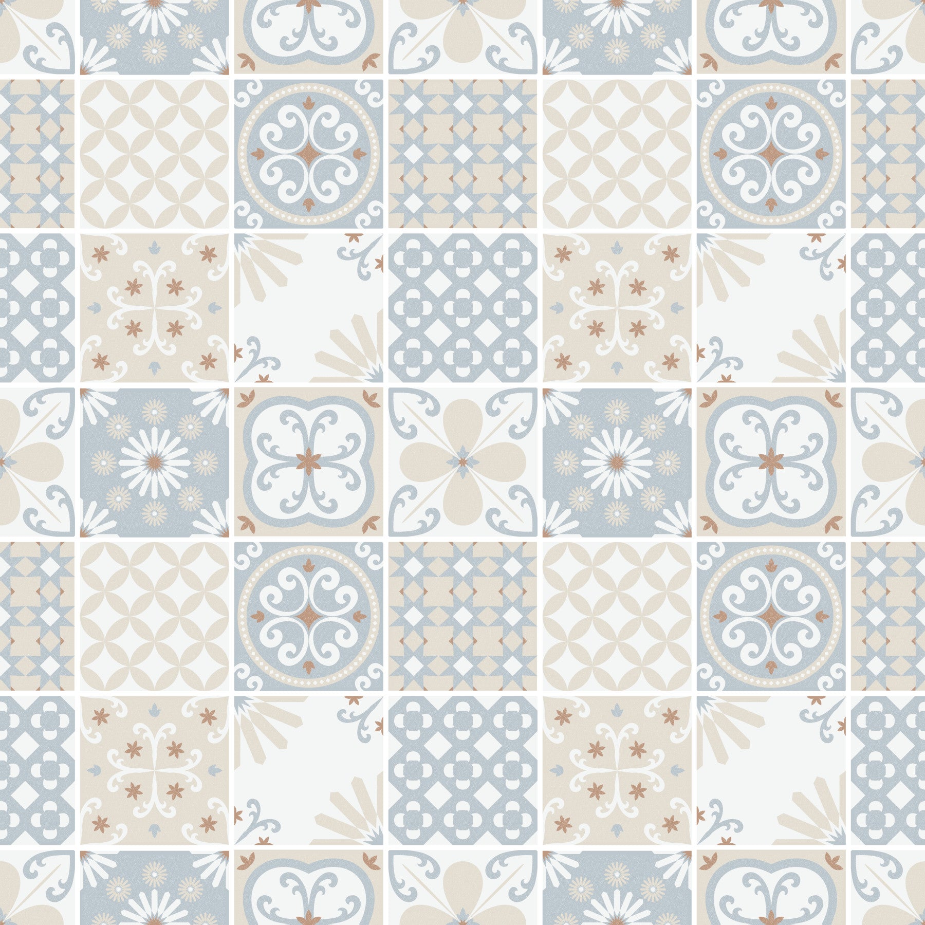 A refined mix of pale blue, beige, and white evokes coastal charm and vintage craftsmanship. This pattern blends nostalgia with a calm, contemporary feel.
