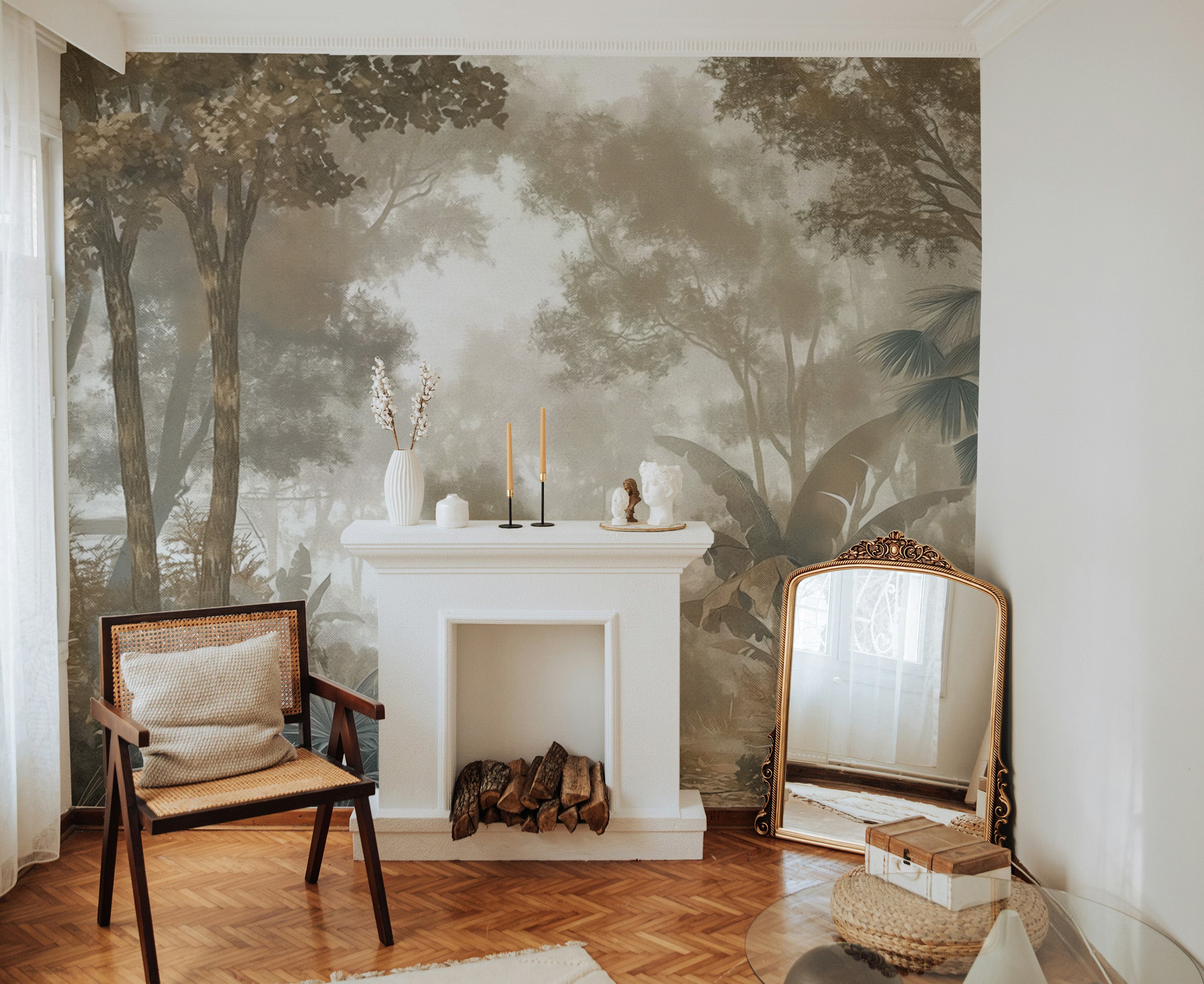 Experience the charm of nature with the vintage forest wall mural, featuring misty rainforest wallpaper in earthy tones. Tall trees, lush foliage, and soft fog create a serene escape, perfect for any setting. This botanical landscape wallpaper blends muted greens and warm browns, offering a timeless aesthetic. Inspired by classic illustrations, the tropical jungle wallpaper adds depth and elegance to the walls. Its rich textures and intricate details bring a natural touch, making it a standout feature. Designed for versatility, this foggy forest wallpaper mural complements various styles, from rustic to modern. Let the beauty of nature define the walls effortlessly.