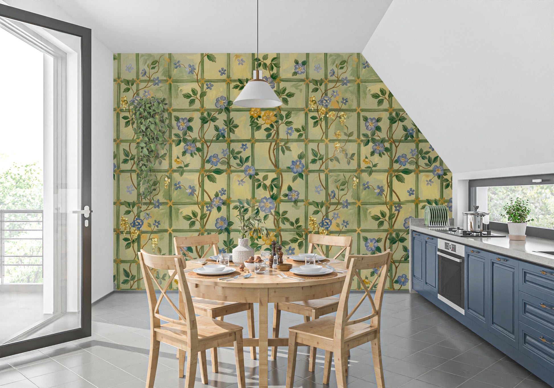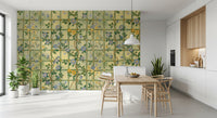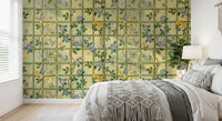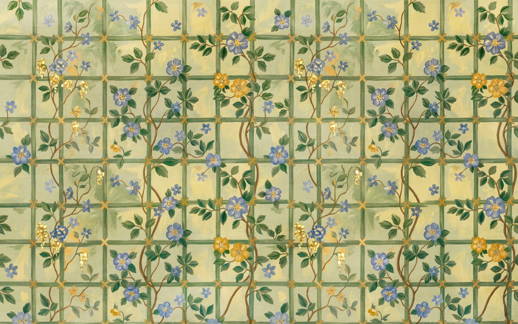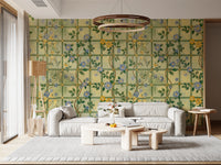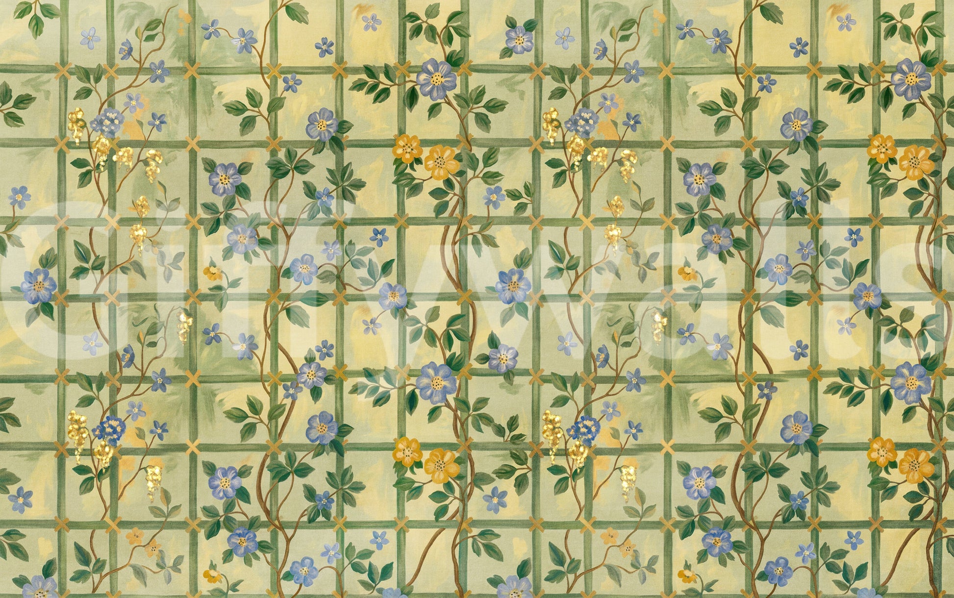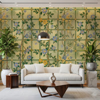 Step into a timeless English garden with this enchanting wall décor. Featuring delicate blue blossoms interspersed with golden flowers climbing a trellis pattern, it evokes a sense of classic romance and understated elegance. The subtle colour palette of soft greens and yellows creates a soothing backdrop, while the intricately drawn flowers add a touch of refined beauty to any space. Bring the charm of a vintage rose garden indoors and let this design transform your walls into a serene and captivating sanctuary. Perfect for adding a touch of floral sophistication and a hint of historical charm.