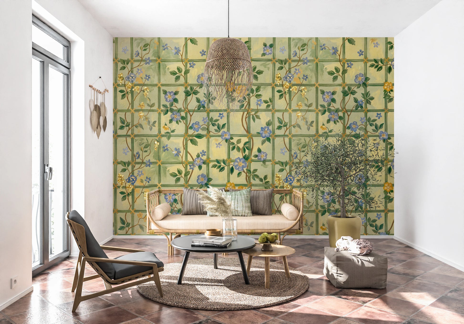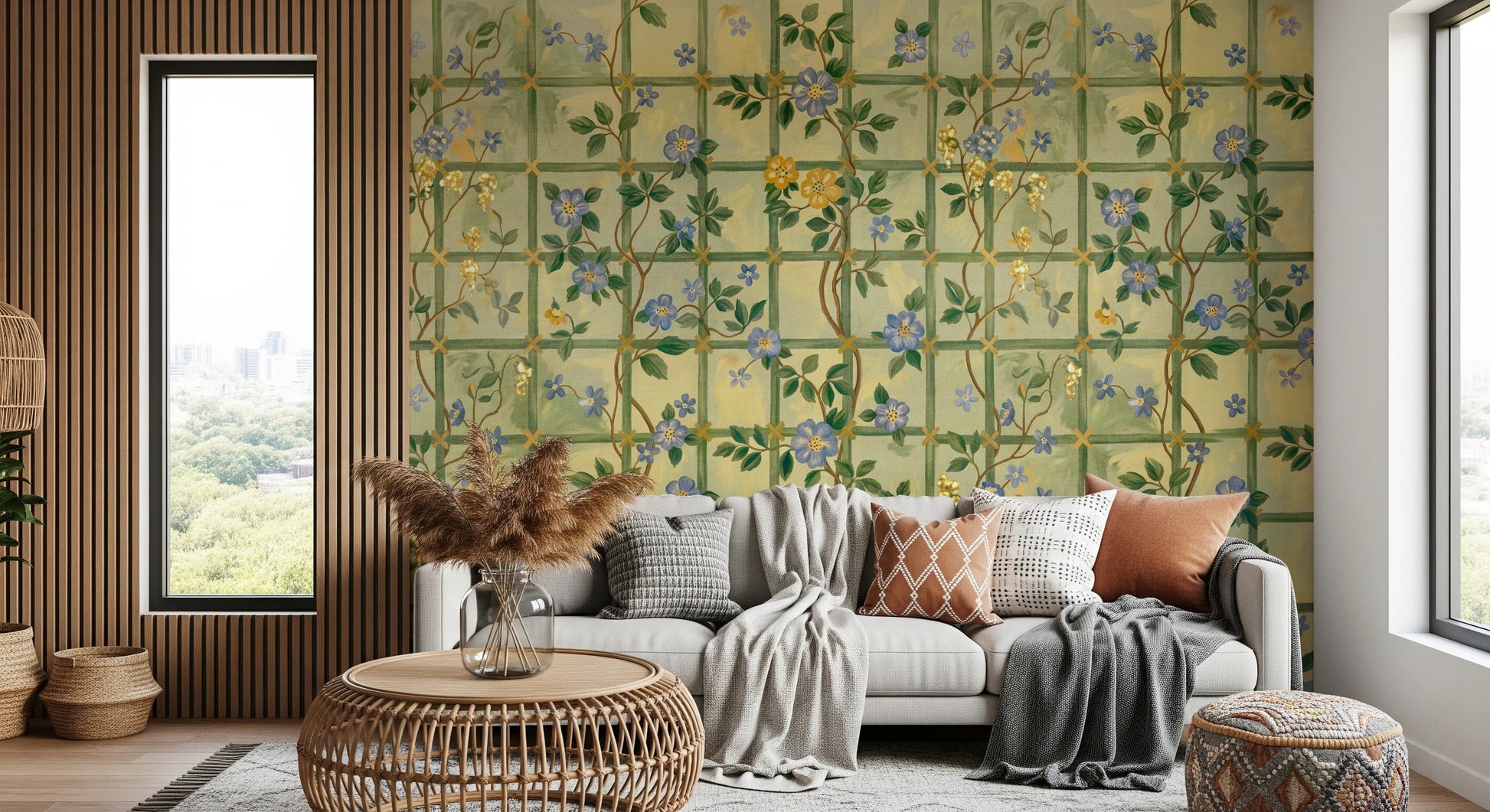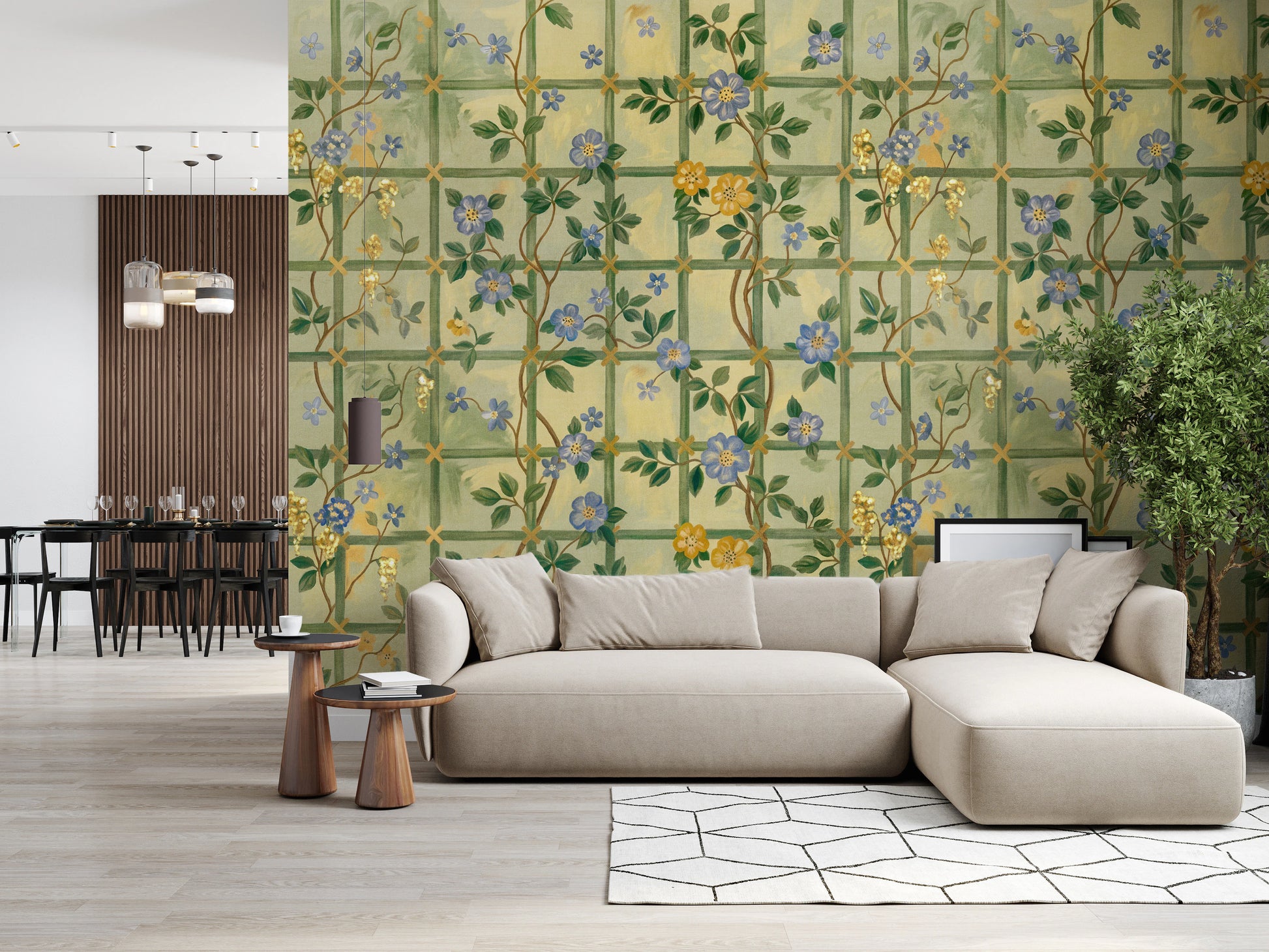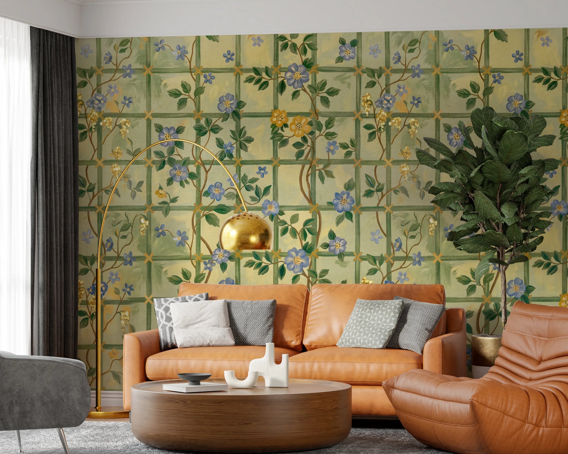 Step into a timeless English garden with this enchanting wall décor. Featuring delicate blue blossoms interspersed with golden flowers climbing a trellis pattern, it evokes a sense of classic romance and understated elegance. The subtle colour palette of soft greens and yellows creates a soothing backdrop, while the intricately drawn flowers add a touch of refined beauty to any space. Bring the charm of a vintage rose garden indoors and let this design transform your walls into a serene and captivating sanctuary. Perfect for adding a touch of floral sophistication and a hint of historical charm.