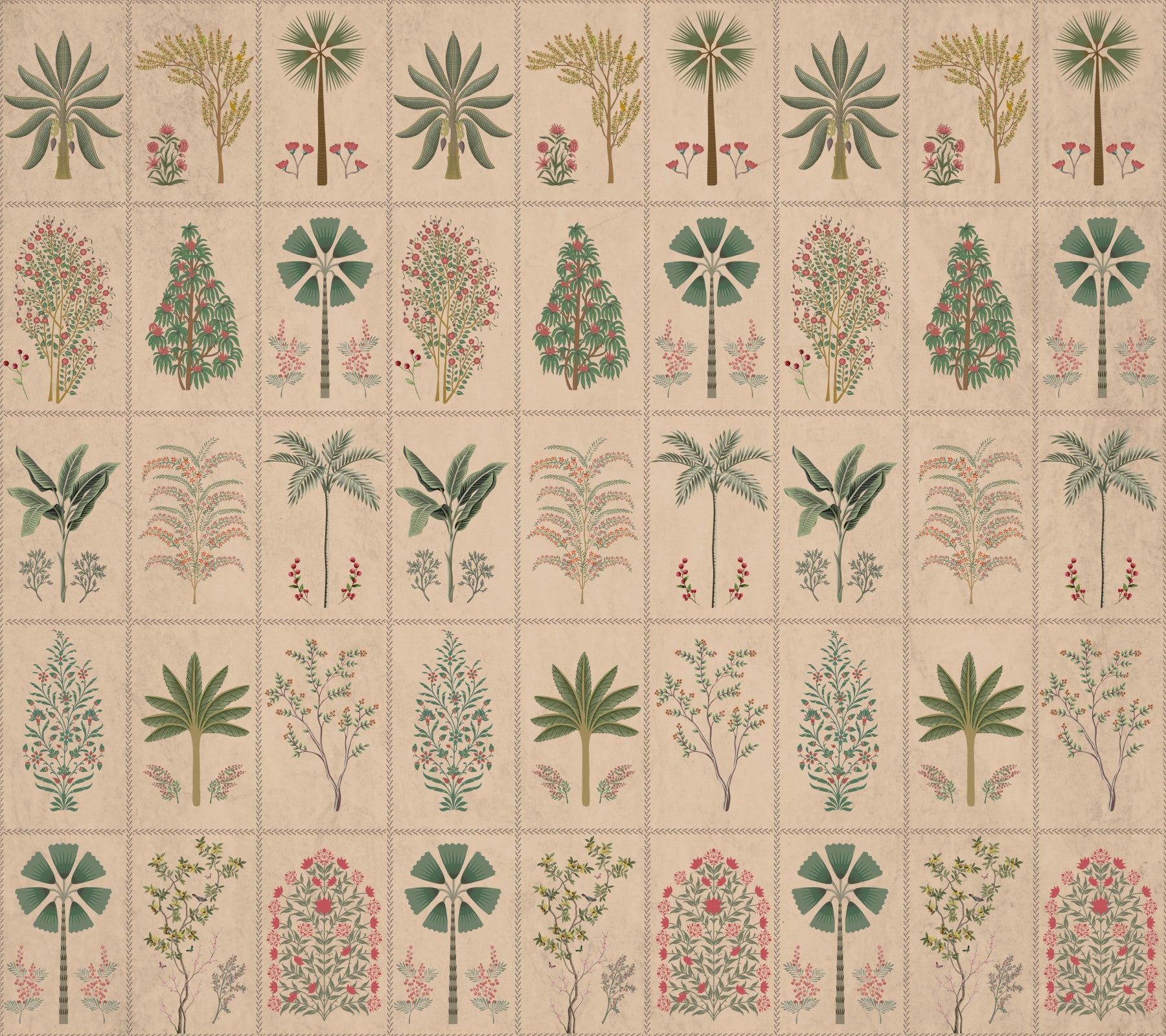 Transform your space with this vintage garden tile-inspired wallpaper. The design features blocks of stylized flora and trees, reminiscent of hand-printed textiles. The muted palette of green, beige, and red gives a relaxed, timeless feel. Use this wallpaper for walls to create a feature wall in your living room, bedroom, or hallway. Its versatile style complements various décor choices, from farmhouse to bohemian. This wallpaper adds visual interest while maintaining a calming ambiance.