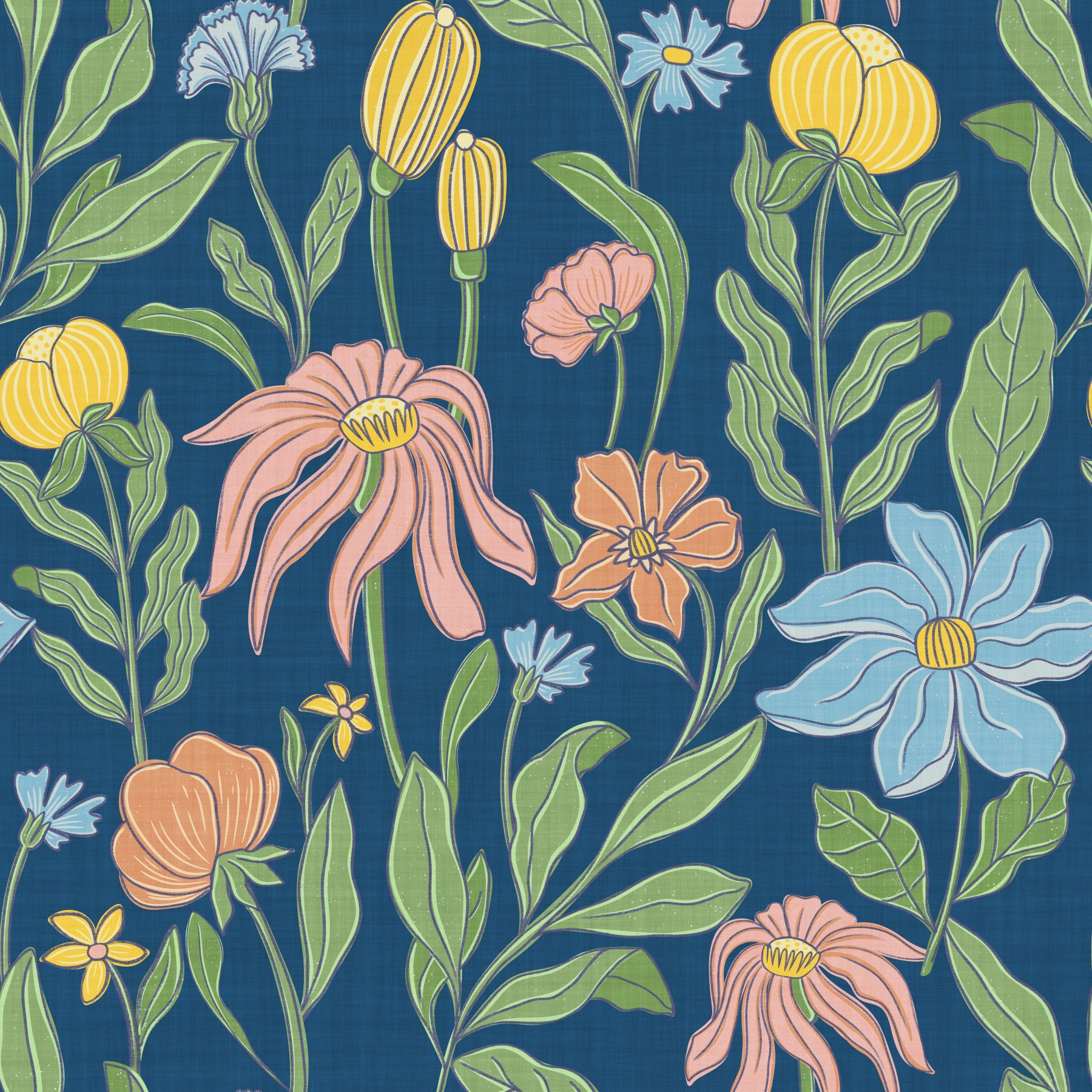 Introduce classic charm with this detailed floral wallpaper. Soft hues of orange, pink, and yellow dance upon a deep blue canvas. The design lends a sense of calm and nature to your home. Perfect for a bedroom, living room, or dining area, this wallpaper for walls blends vintage style with modern sensibilities. Its gentle colour palette creates a welcoming retreat that complements classic and contemporary interiors, adding warmth and character.