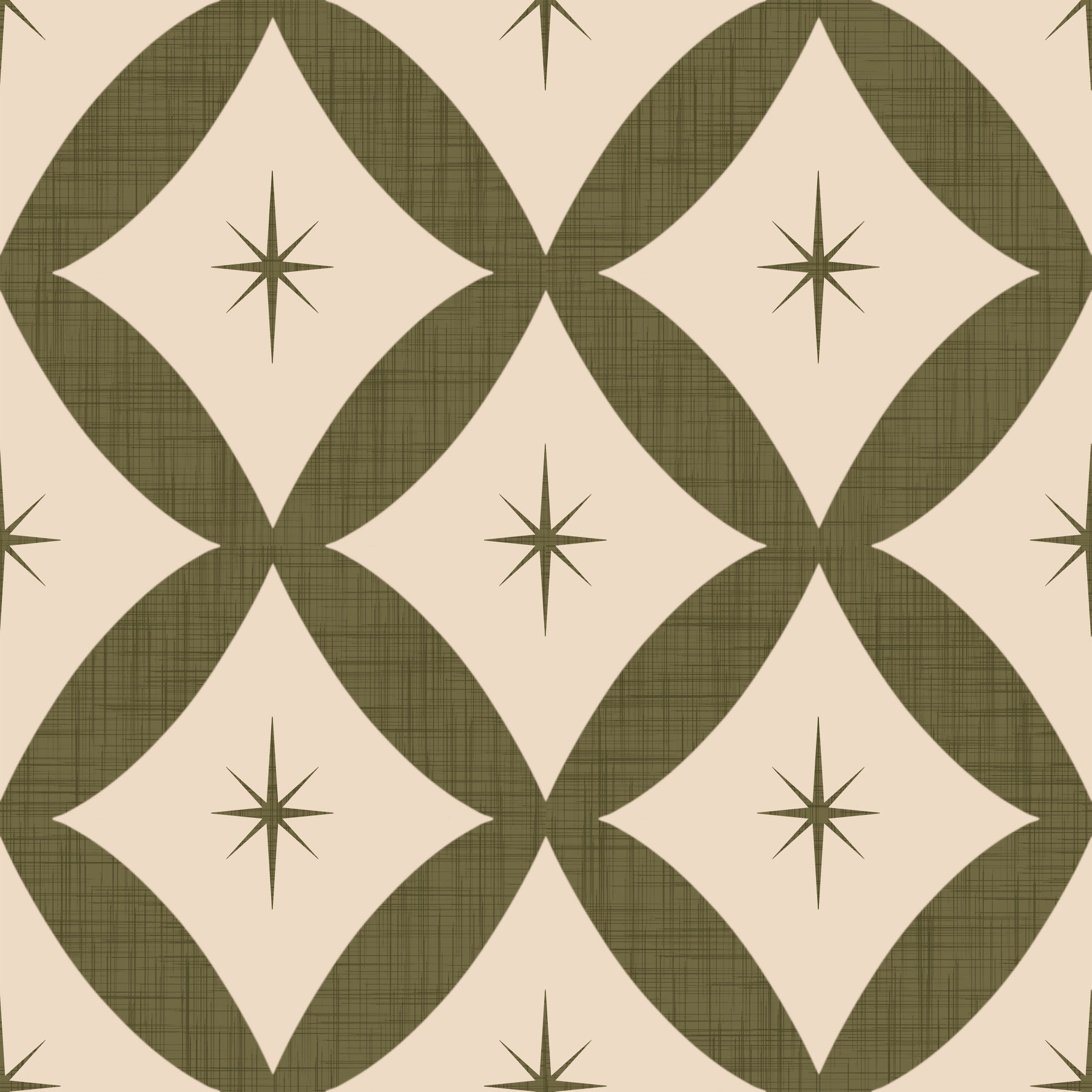 Decorative vintage wallpaper with olive green diamond shapes and centered starbursts.
