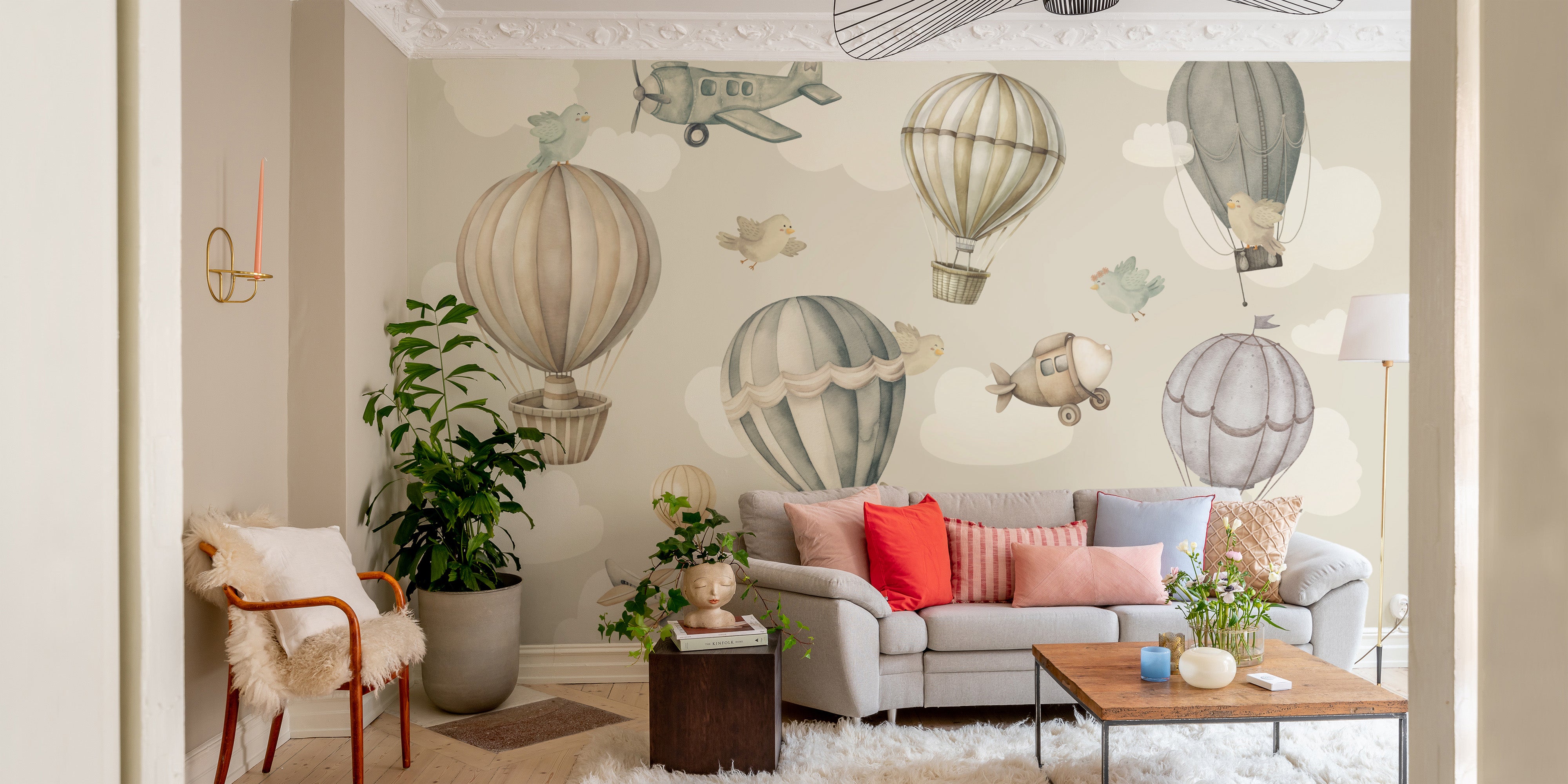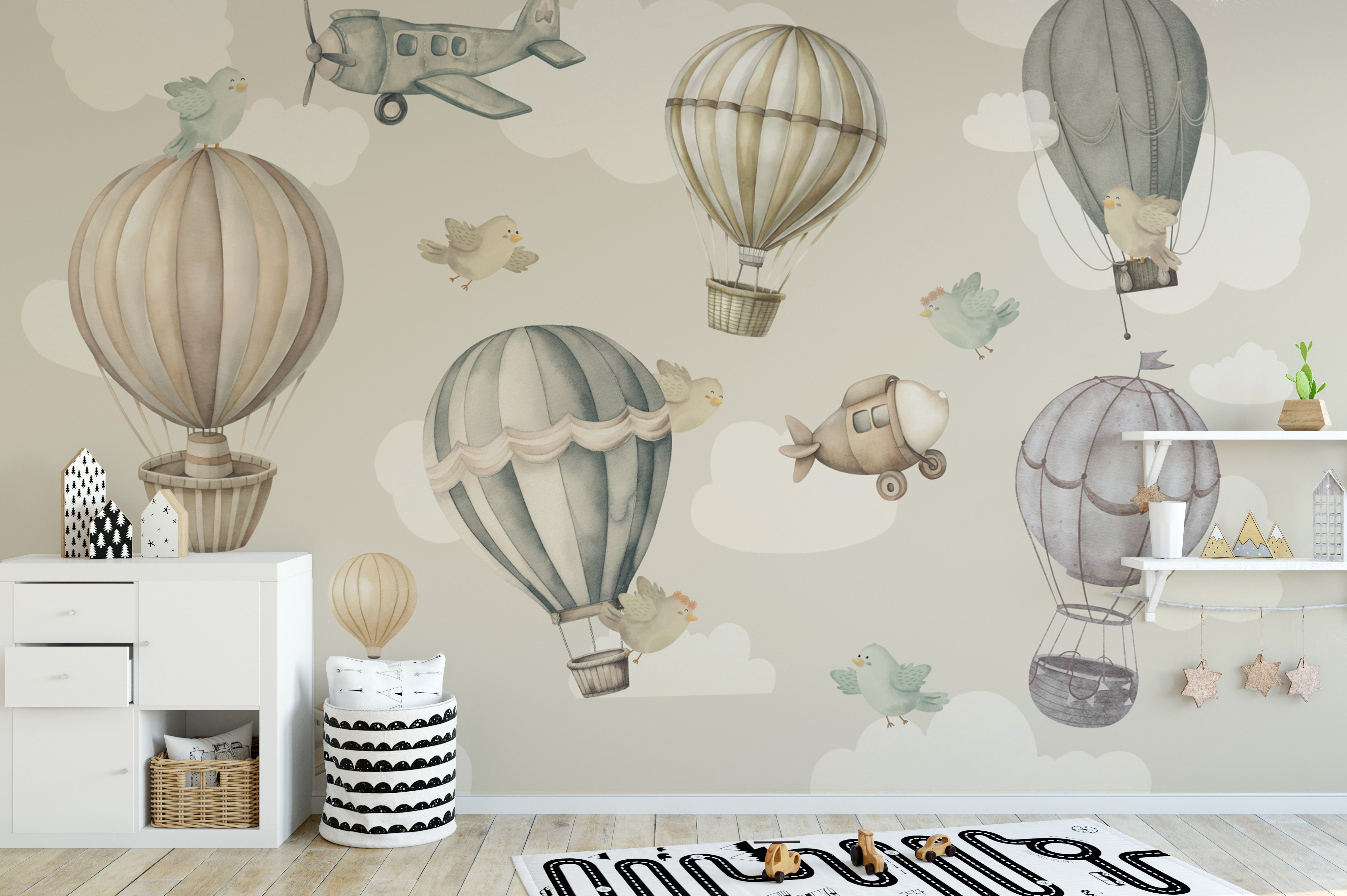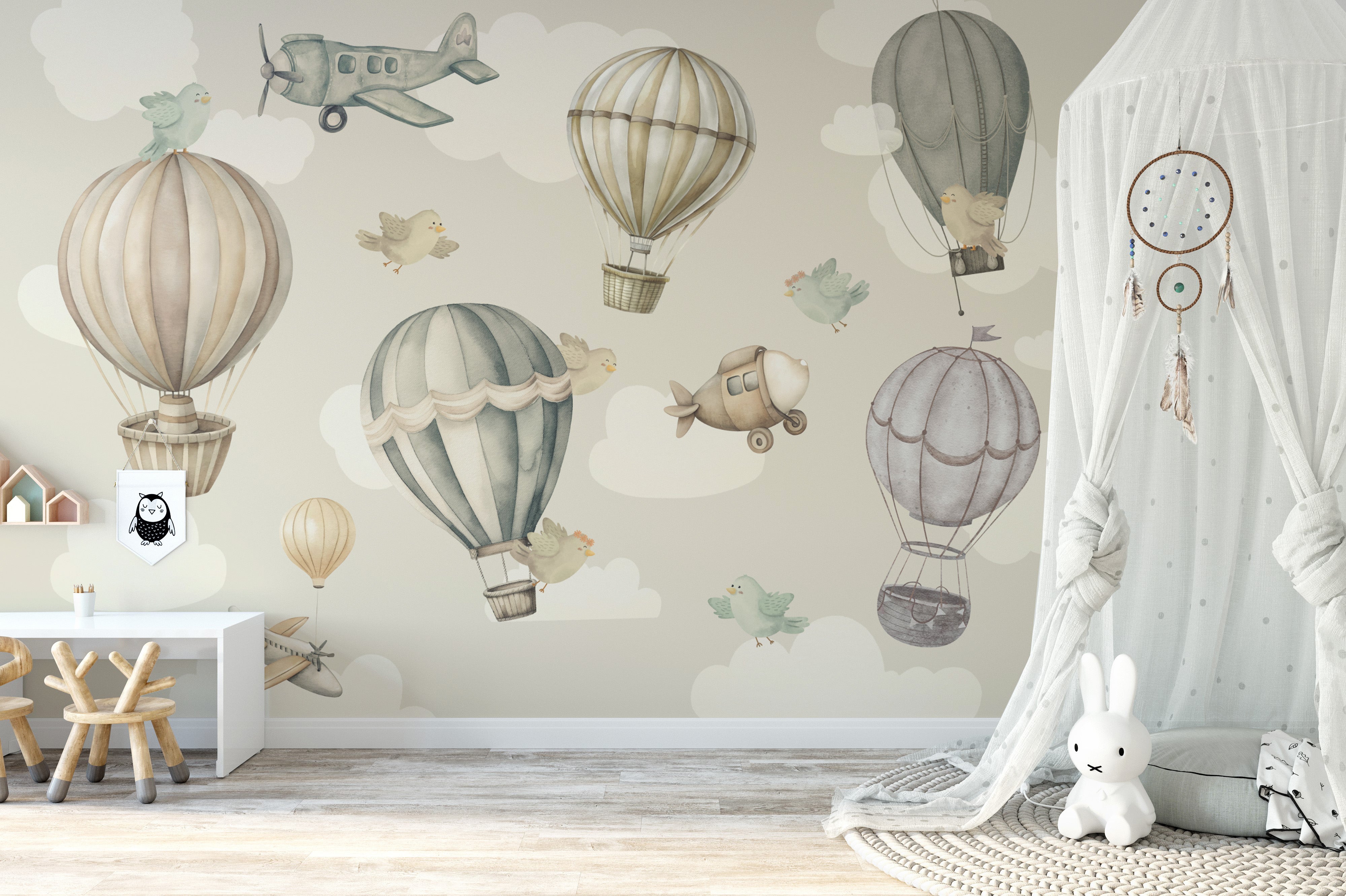 Drift into a dreamy adventure with Vintage Hot Air Balloon Nursery Wallpaper. Soft watercolor tones and hot air balloons float among gentle clouds, creating a serene sky theme. This design is perfect for a hot air balloon nursery and adds a whimsical touch with retro airplanes and playful birds. The adventure-themed nursery wallpaper brings a sense of wonder, making it ideal for kids' rooms. The vintage aviation nursery wallpaper is designed with a timeless aesthetic and complements classic and modern interiors. Hot air balloon wall decals blend seamlessly, enhancing the enchanting scene. Let little explorers enjoy a skyward journey with this charming wallpaper.