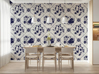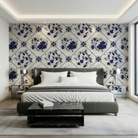 Embrace the timeless allure of vintage design with our "Vintage Indigo Floral Tiles". This stunning wall décor evokes the charm of handcrafted artistry, reminiscent of traditional ceramic tiles. The repeating pattern features delicate floral motifs in a rich indigo hue, artfully presented on an aged, slightly textured backdrop. The indigo designs pop against the light, off-white background, creating an intriguing visual contrast that is both calming and sophisticated. These beautifully rendered floral accents, interspersed with vintage distressing, add depth and character to any room, creating a stylish focal point. Transform your space into a haven of understated elegance with this classic and refined wall covering, bringing a touch of old-world grace to modern interiors. It captures the essence of time-worn beauty and breathes new life into your walls.