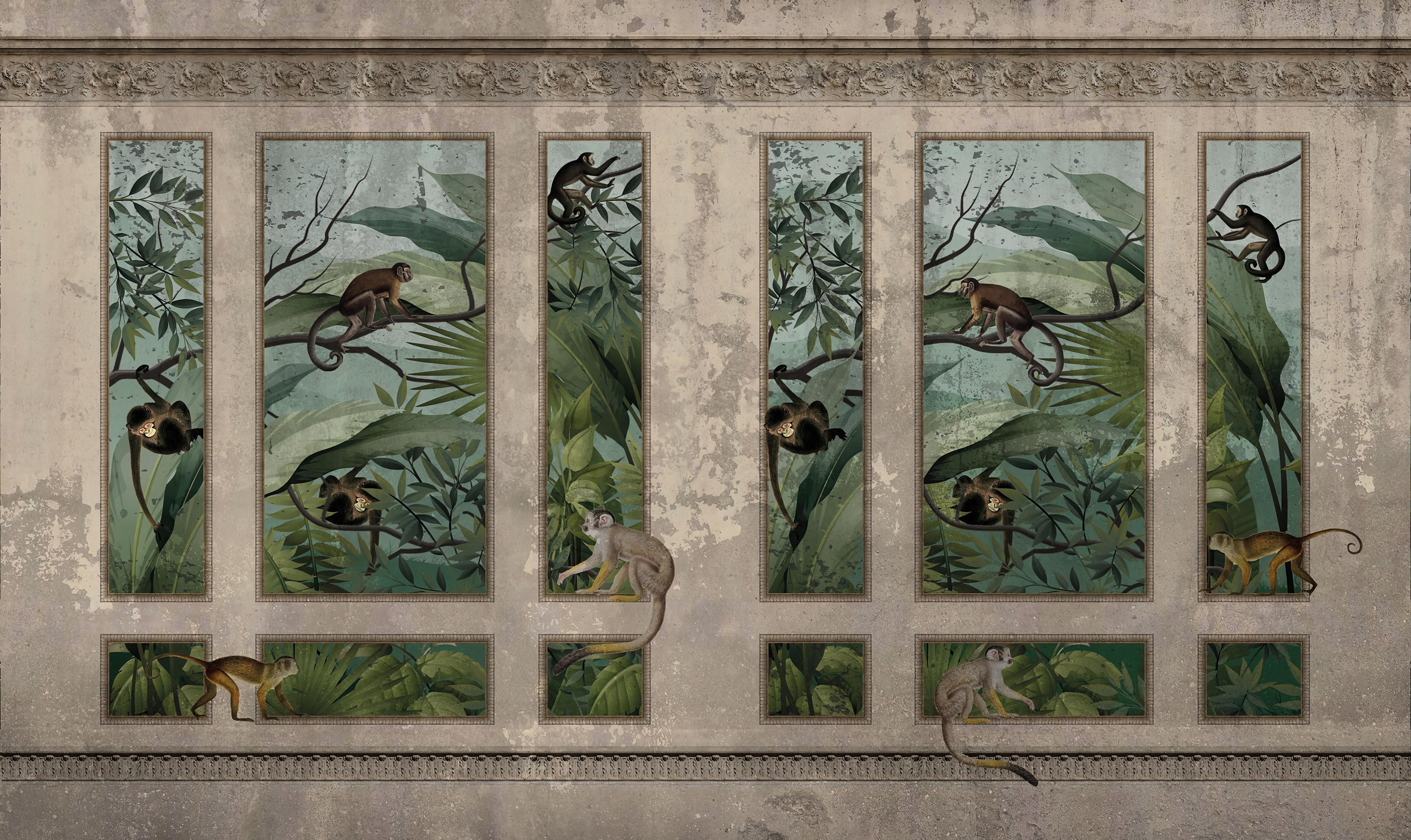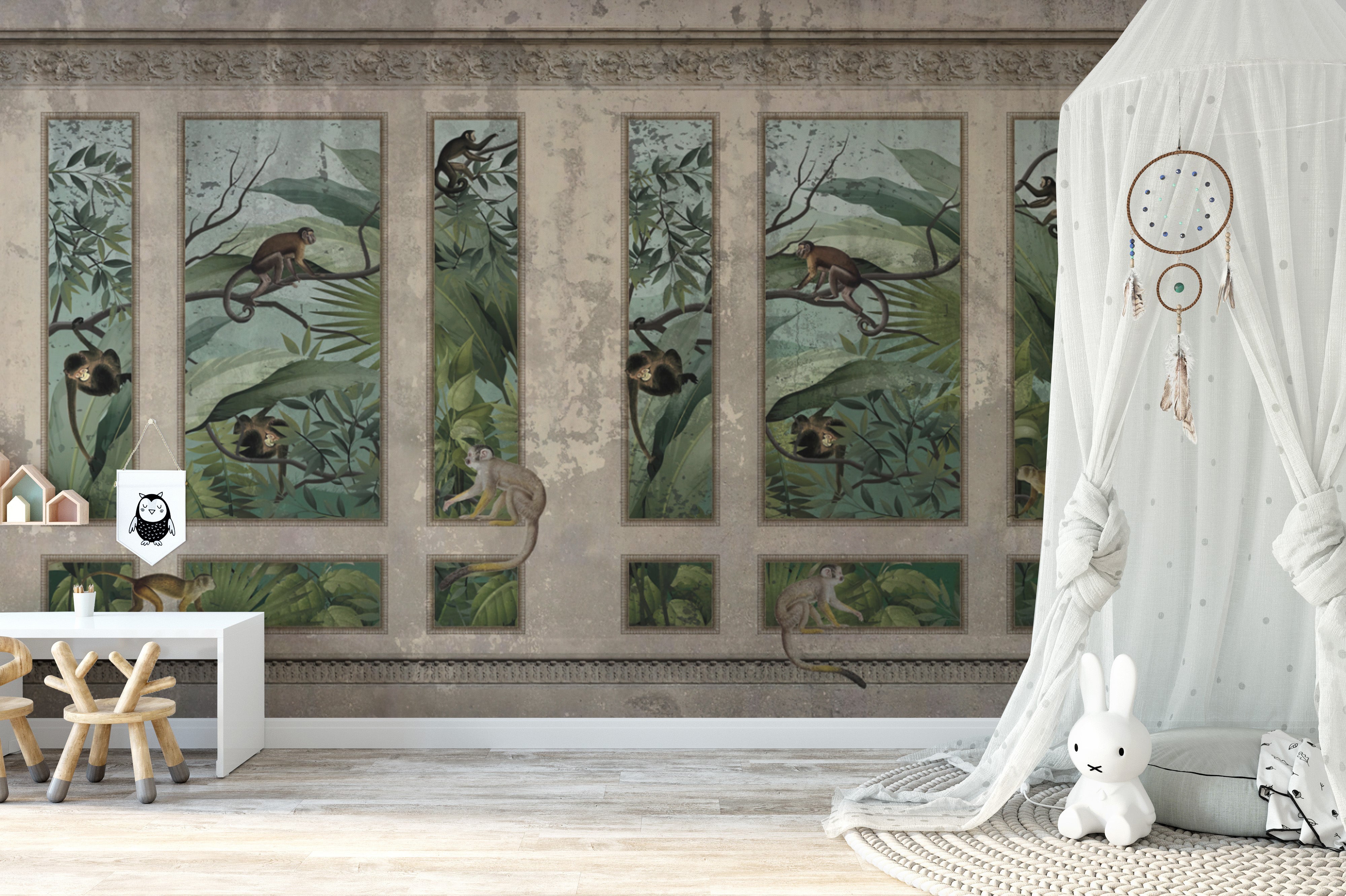 A vintage jungle monkey mural is all about what blueprint: a neat combination of the aesthetics of tropical rainforest wallpaper and antique botanical wallpaper. With monkeys at play in a thick forest of green, this monkey jungle mural adds exotic charm to any interior. The vintage effect of tropical wall decor enhances its classic aesthetic, making it perfect for living rooms, bedrooms, or creative spaces. Based on Victorian jungle murals, this luxury jungle wallpaper brings the beauty of nature indoors. This wildlife scenery wallpaper will elevate your decor; easy to install and ever-in-style. Order now and embrace decorative jungle wall art!