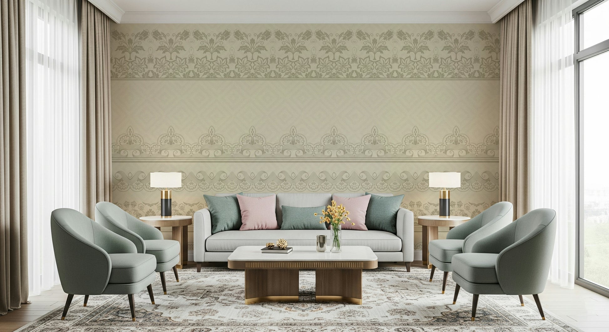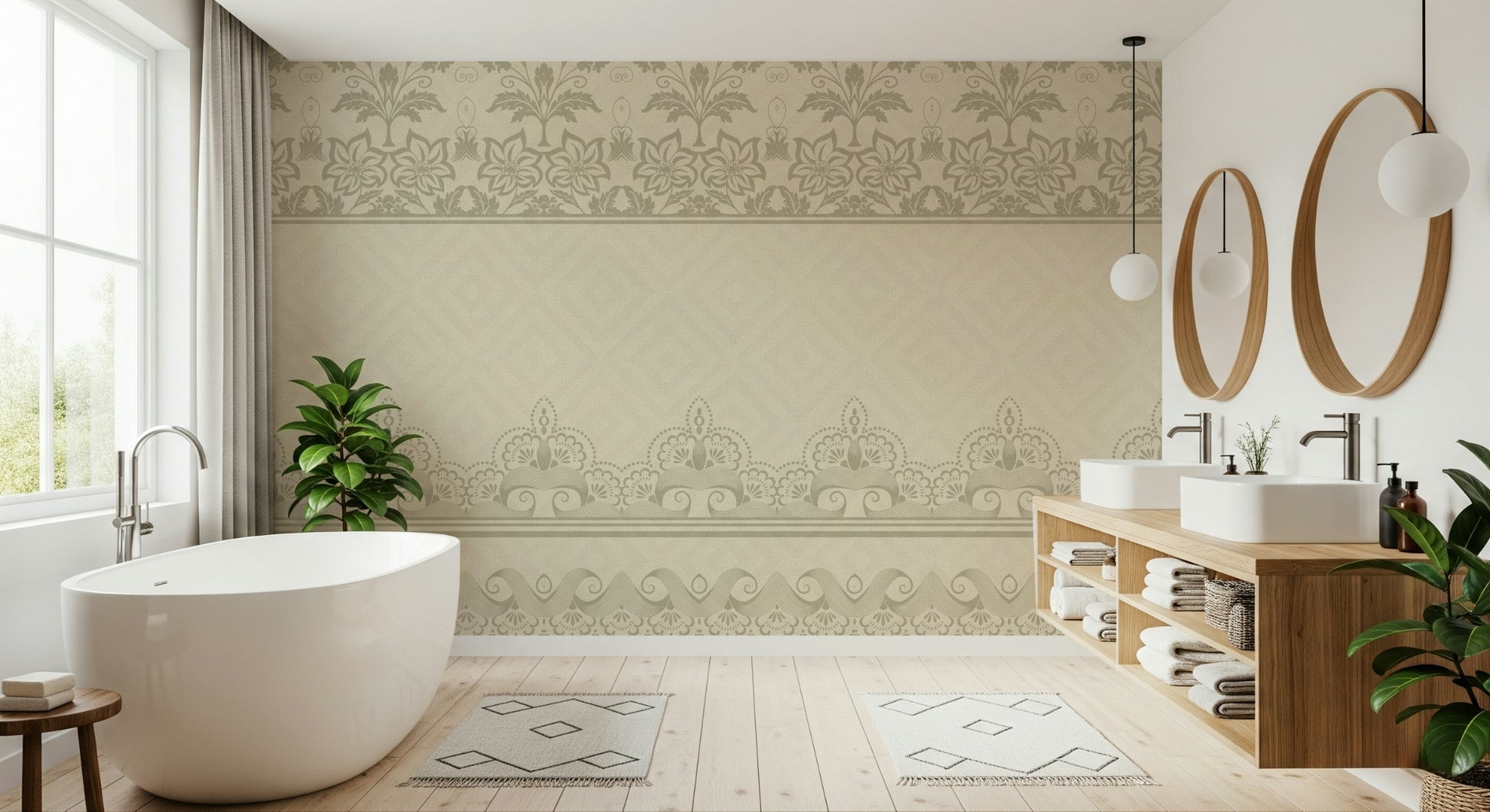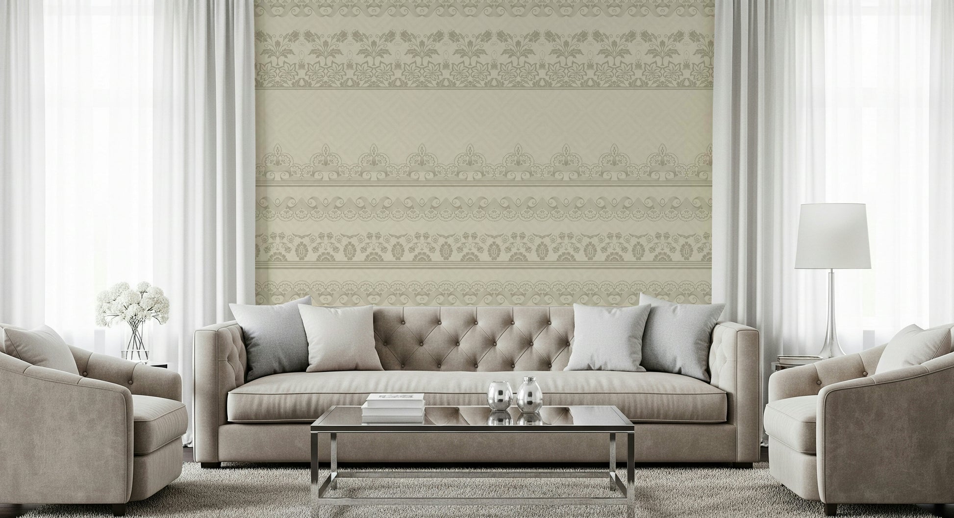 Introduce refined detail to your interiors with this classic wallpaper for walls. The layered lace bands create a subtle texture with refined floral and scrollwork motifs. The warm beige palette brings a soft, comforting feel to any room. Ideal for bedrooms, living rooms, or hallways, this design adds understated refinement. It provides a backdrop that blends well with various décor styles, from traditional to contemporary. The intricate elements of the lace enhance the sense of space and depth within the room.